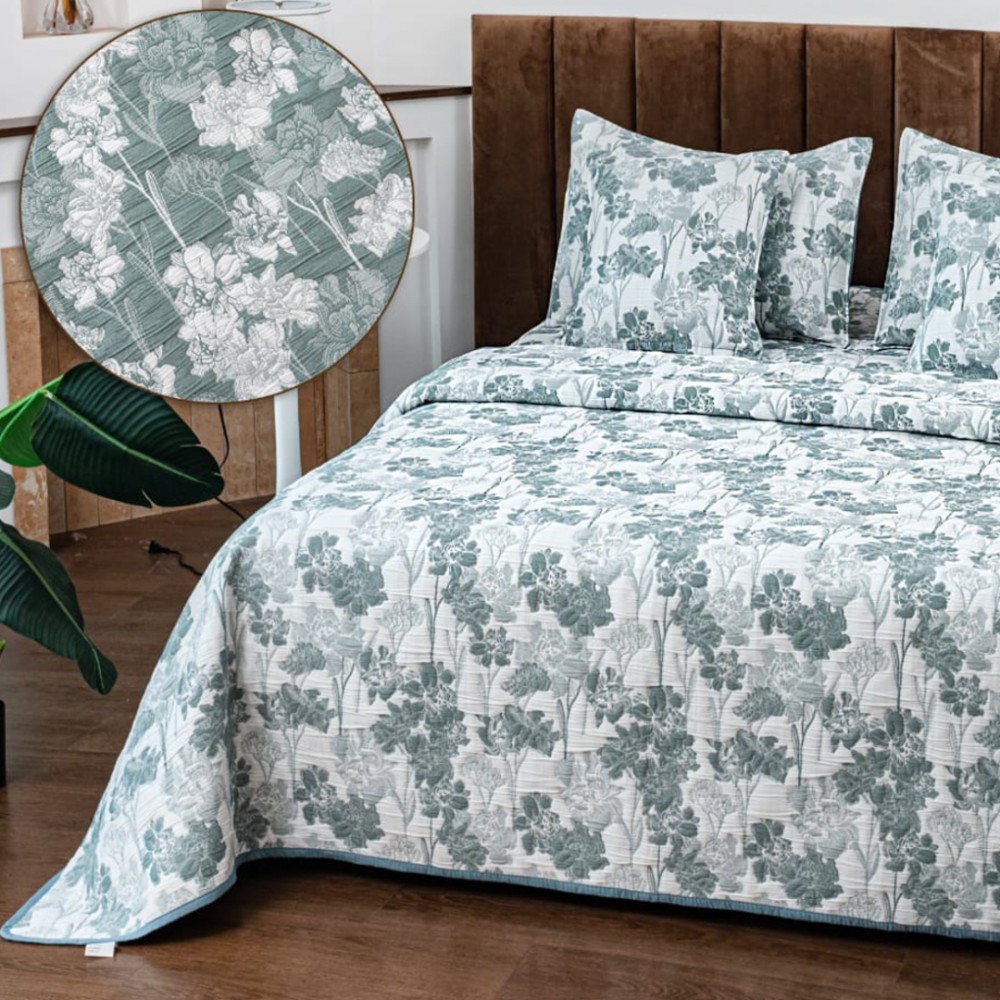 Cuvertura Pat Dublu, Bumbac cu In, Model Brodat Direct în Tesatura, 230x250 cm, 2 fete de perna 52x72cm, 2 fete de perna 46x46cm, Alb, Verde, Flori, Insula Lenjeriei, cod produs: INS-CVY13