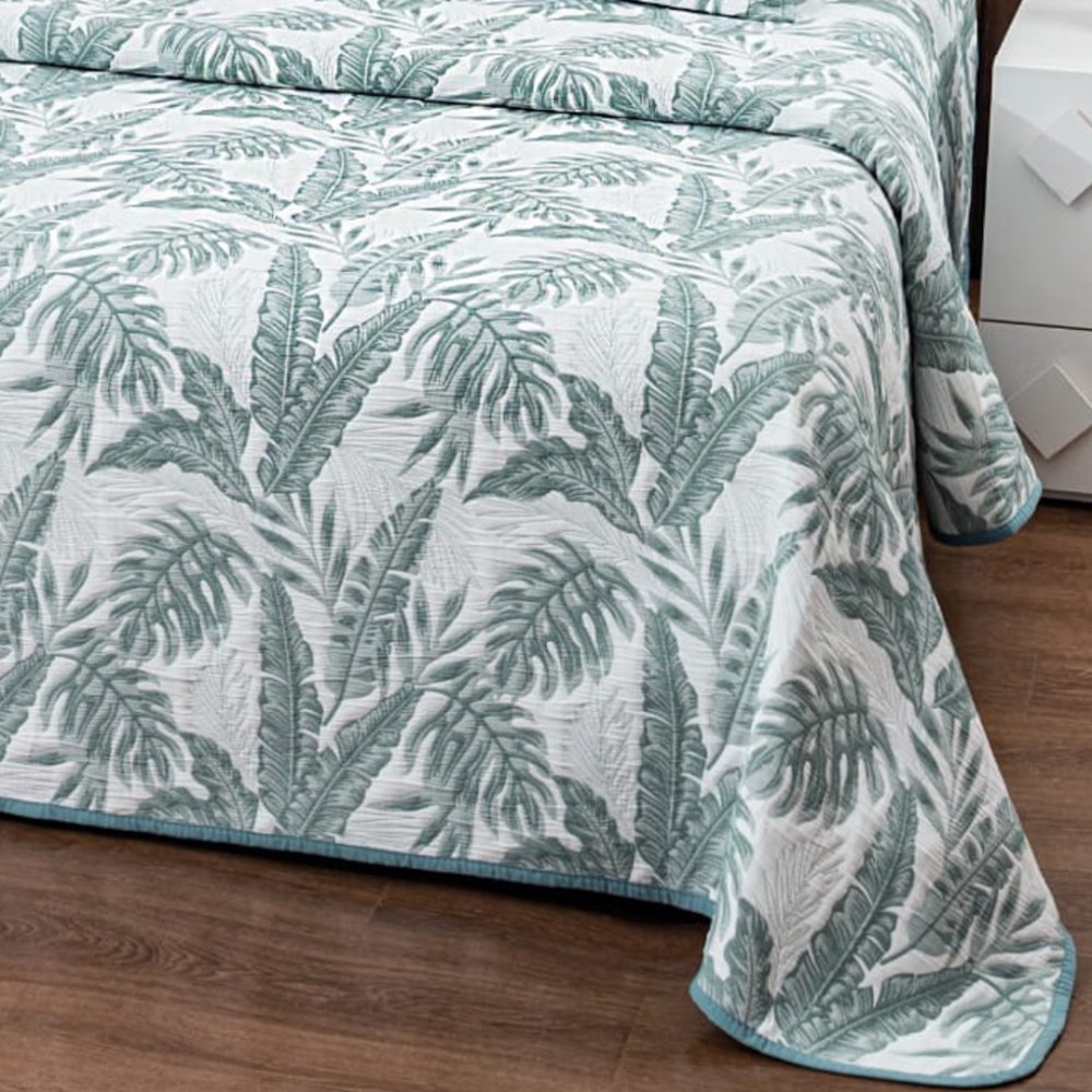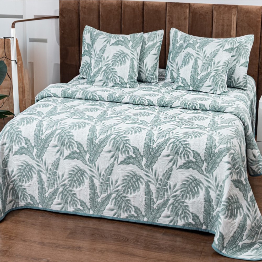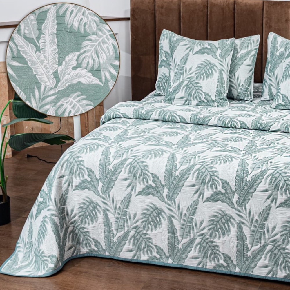Cuvertura Pat Dublu, Bumbac cu In, Model Brodat Direct în Tesatura, 230x250 cm, 2 fete de perna 52x72cm, 2 fete de perna 46x46cm, Alb, Verde, Frunze, Insula Lenjeriei, cod produs: INS-CVY07