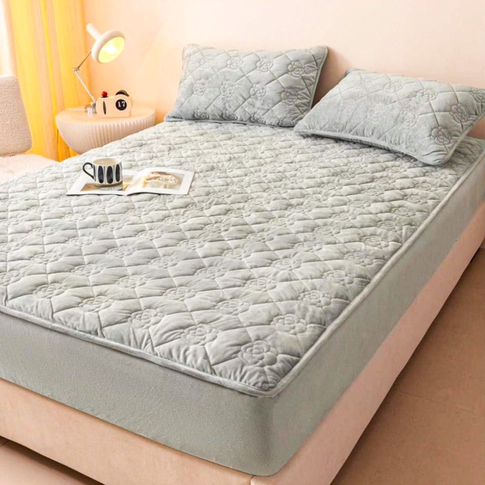 Husã Matlasatã tip Topper din Catifea Brodata, 140x200cm + 2 fete de perna 50x70cm, Flower Embroidery, Gri deschis, Casa Minunata, cod produs: YN-HTC-02