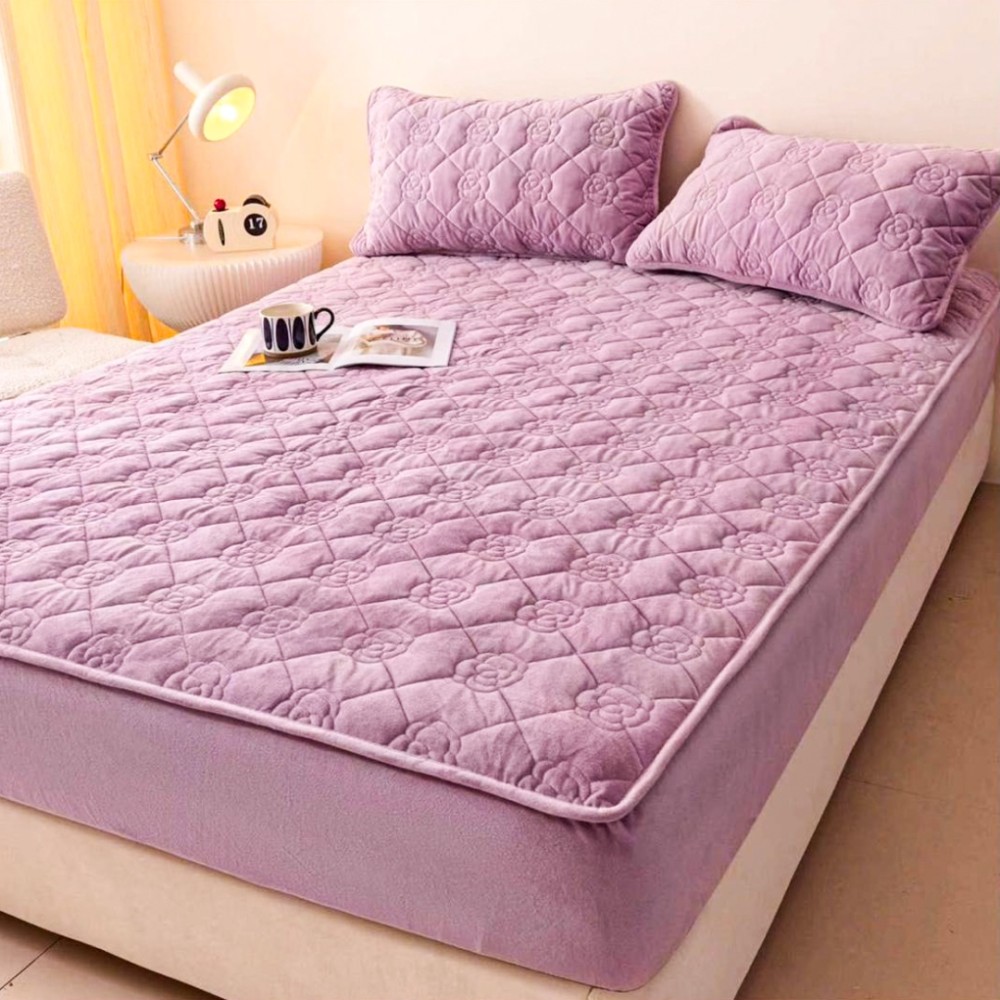Husã Matlasatã tip Topper din Catifea Brodata, 160x200cm + 2 fete de perna 50x70cm, Flower Embroidery, Lila, Casa Minunata, cod produs: YN-HTC-10