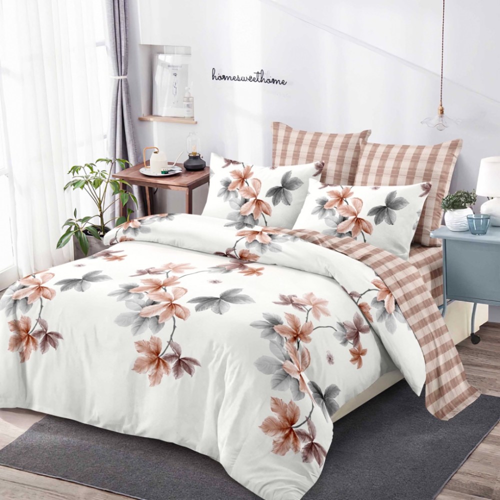 Lenjerie pat dublu, FINET, cu elastic, 6 piese, Crem, Maro, Flori, Super Design Pucioasa, cod produs: SDP-FEB-667