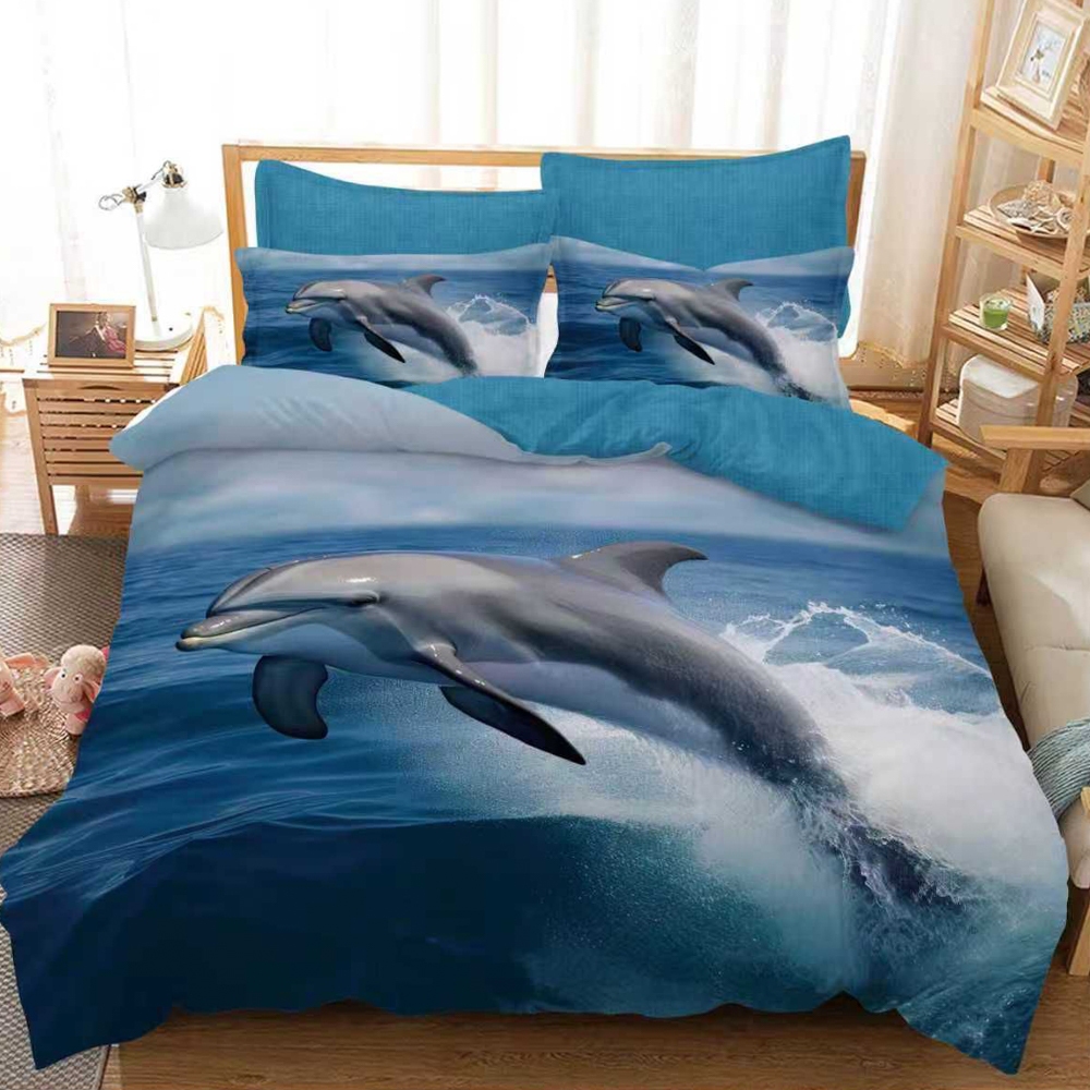 Lenjerie pat dublu, FINET, 6 piese, IDENTICA CU POZA, Albastru, delfin, Johny Home Pucioasa, cod produs: SPR-Q2a-49