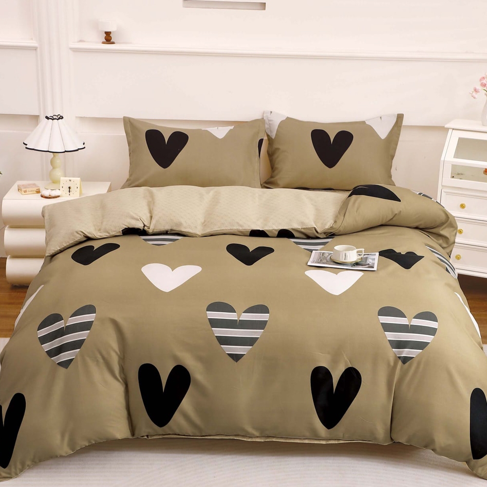 Lenjerie pat dublu cu Elastic (160x200cm si 180x200cm), bumbac satinat, Bej, inimioare, Casa Creative Elegance Pucioasa, cod produs: BCC-SE-41