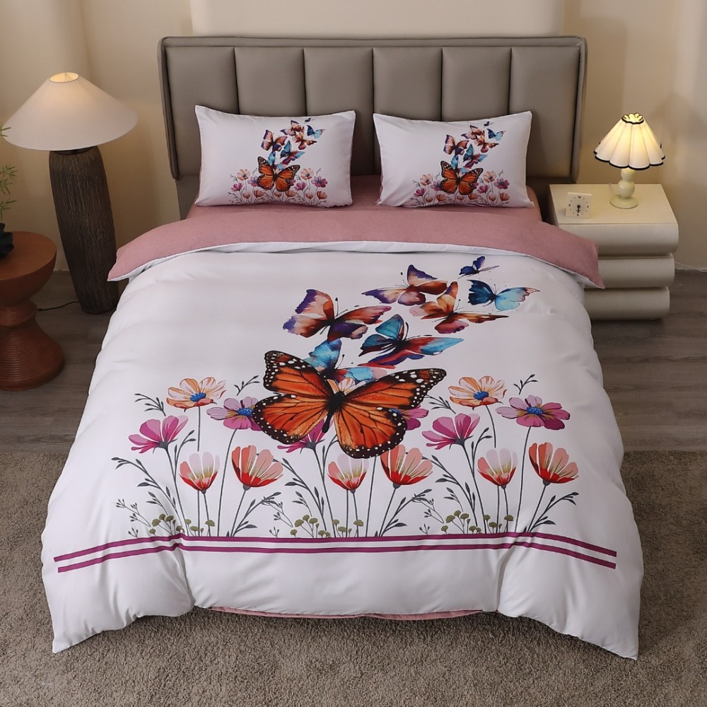 Lenjerie pat dublu, FINET, Imprimeu Digital 5D - Identic cu poza, Cu ELASTIC, 4 piese, Alb, Fluturi , cod produs: BCC-5DF-54