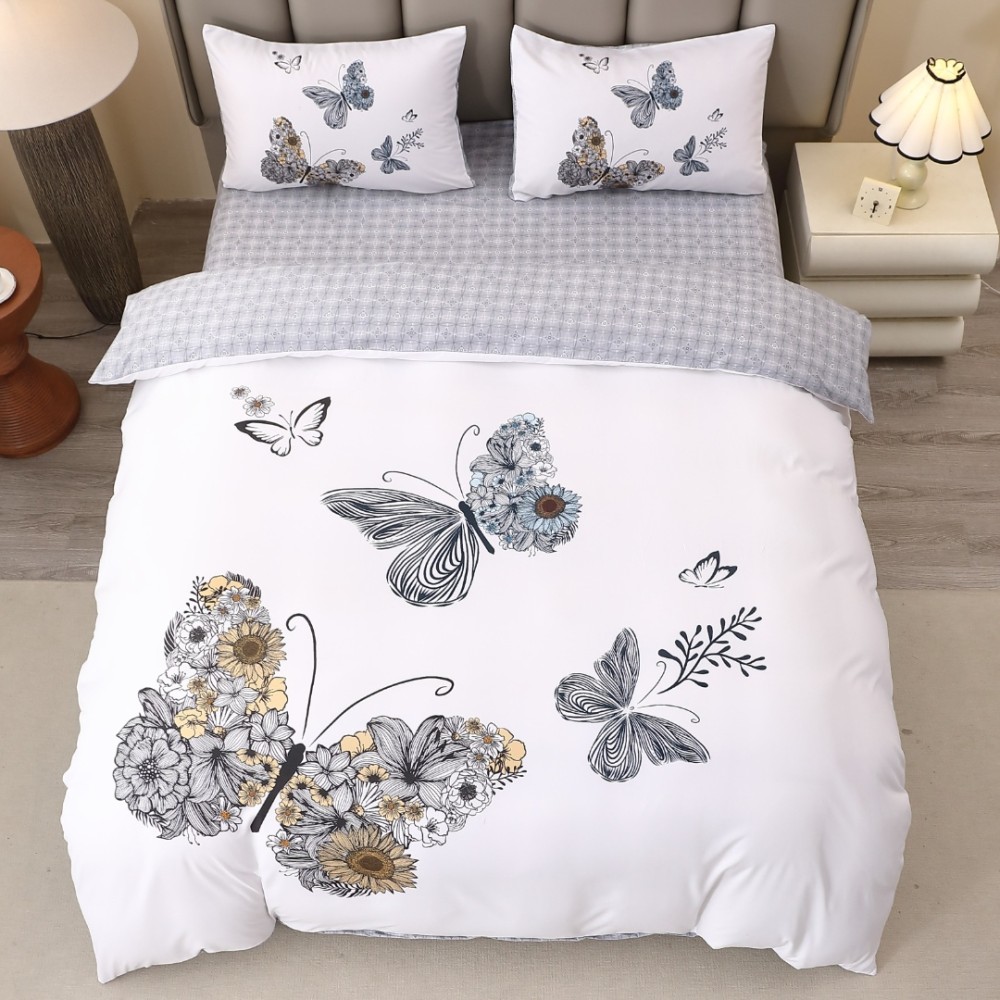 Lenjerie pat dublu, FINET, Imprimeu Digital 5D - Identic cu poza, Cu ELASTIC, 4 piese, Alb, Gri, Fluturi , cod produs: BCC-5DF-67