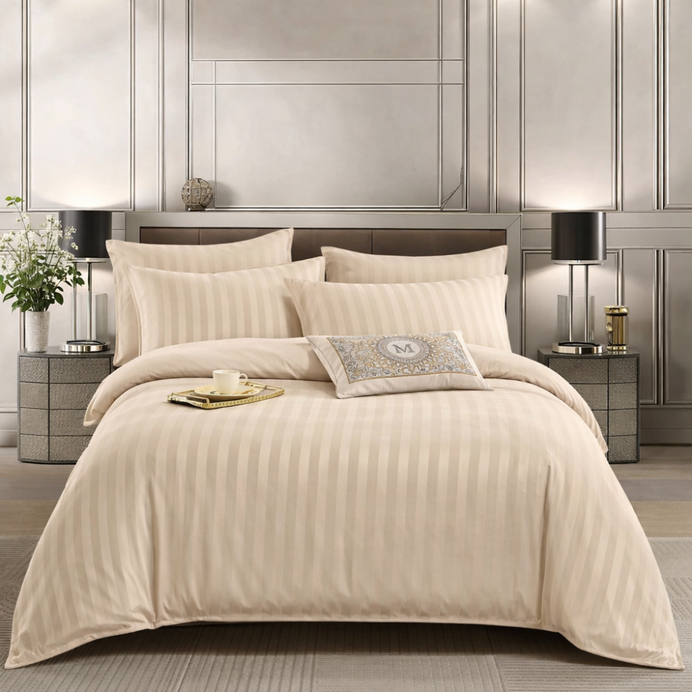 Lenjerie HoReCa, pat dublu, Damasc Finetat Deluxe cu Elastic, 6 piese, Bej deschis, JOJO Home, cod produs: SKT-DE-09
