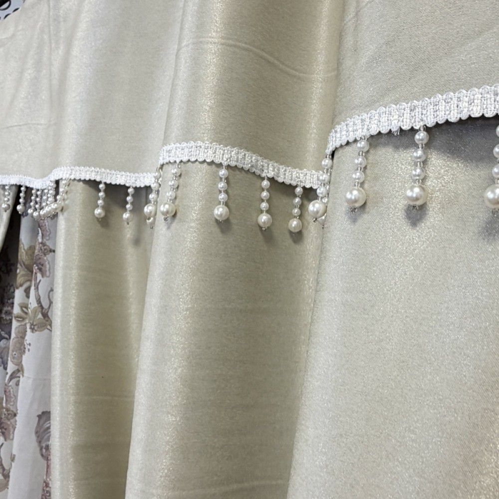 Draperia are dimensiunea de 150 cm lățime x 270 cm înălțime per bucată, însă este croită și cusută împreună într-o singură piesă cu lățimea totală de aproximativ 300 cm. Designul este completat de accesoriu decorativ cu perle, care adaugă un plus de eleganță și rafinament. Sistemul de prindere este realizat cu rejanță tip creion de 6 cm pentru șină, pentru o montare ușoară și falduri uniforme.
