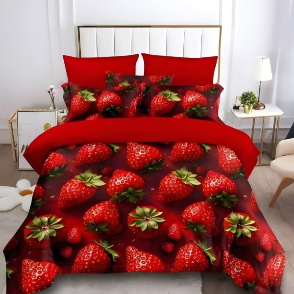 Lenjerie pat dublu, FINET, Imprimeu Digital 5D - Identic cu poza, Cu ELASTIC, 6 piese, Rosu, capsuni, Talo, cod produs: SKT-5D-11