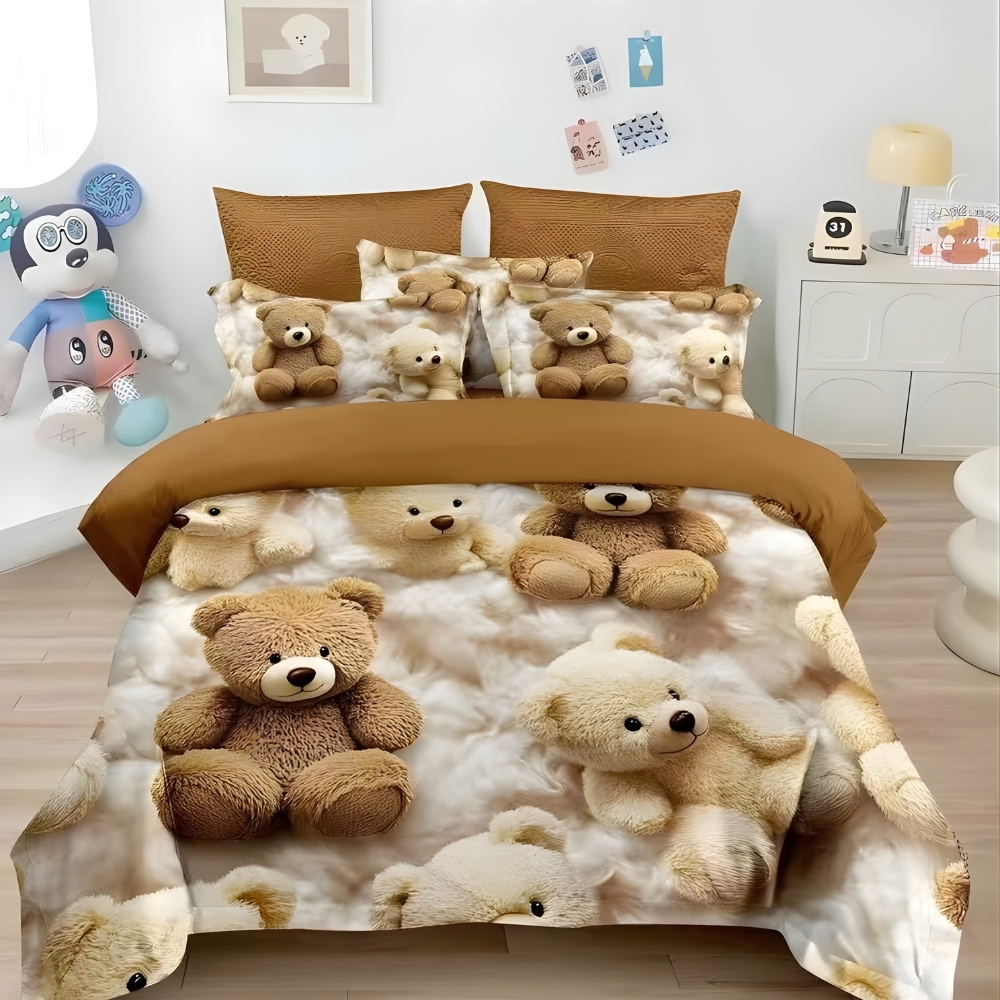 Lenjerie pat dublu, FINET, Imprimeu Digital 5D - Identic cu poza, Cu ELASTIC, 6 piese, Bej, ursuleti, Talo, cod produs: SKT-5D-15