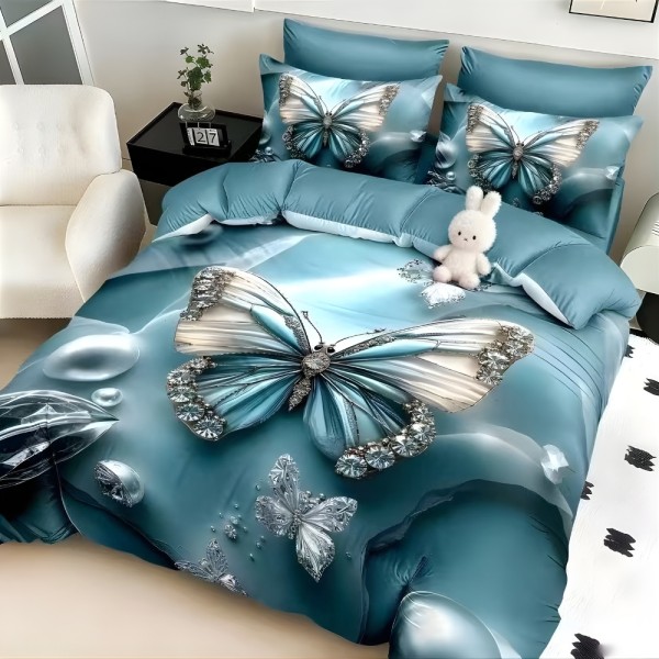Lenjerie pat dublu, FINET, Imprimeu Digital 5D - Identic cu poza, Cu ELASTIC, 6 piese, Turcuaz, fluture, Talo, cod produs: SKT-5D-21