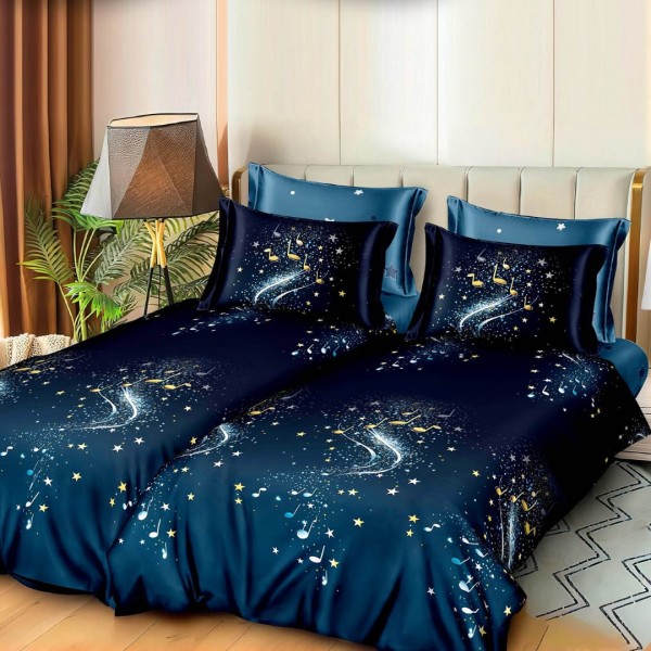 Lenjerie de pat cu 2 cearsafuri pt. pilota, 7 piese, Bumbac Satinat Superior,, Albastru, note muzicale si stelute, Johny Home Pucioasa, cod produs: SPR-K-54
