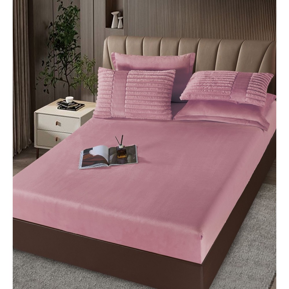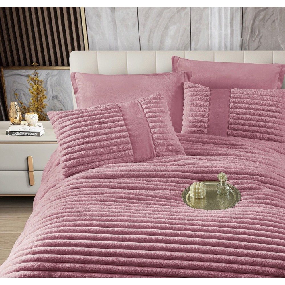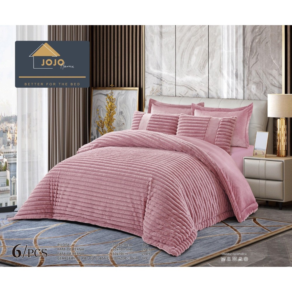 Lenjerie de pat cu Pilota Inclusa, Jojo Home, Cearceaf cu Elastic, 6 Piese, Blană de Iepure Artificială, Roz, cod produs: JOJ-CTM-2