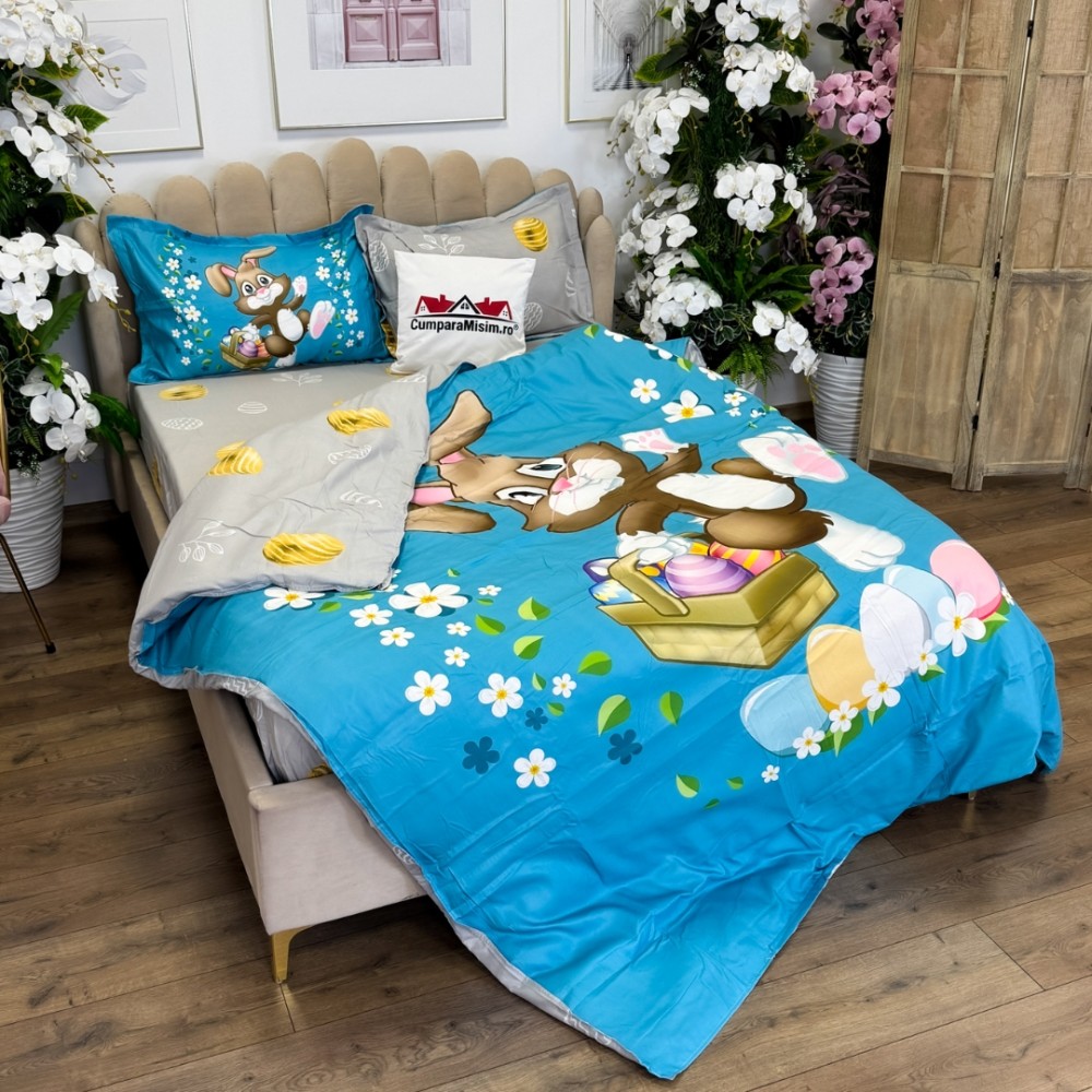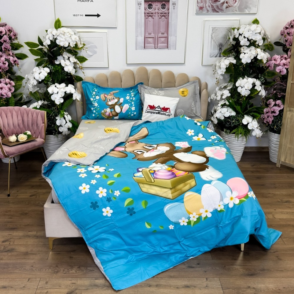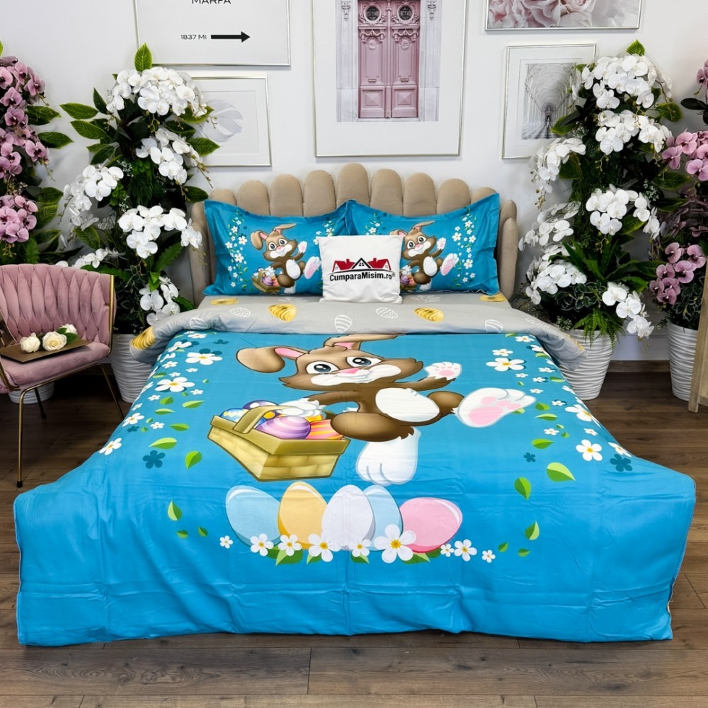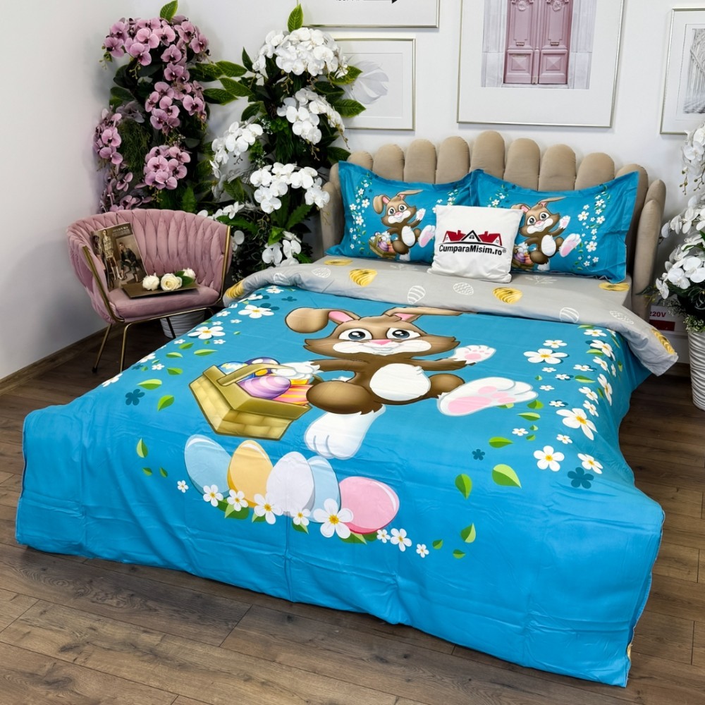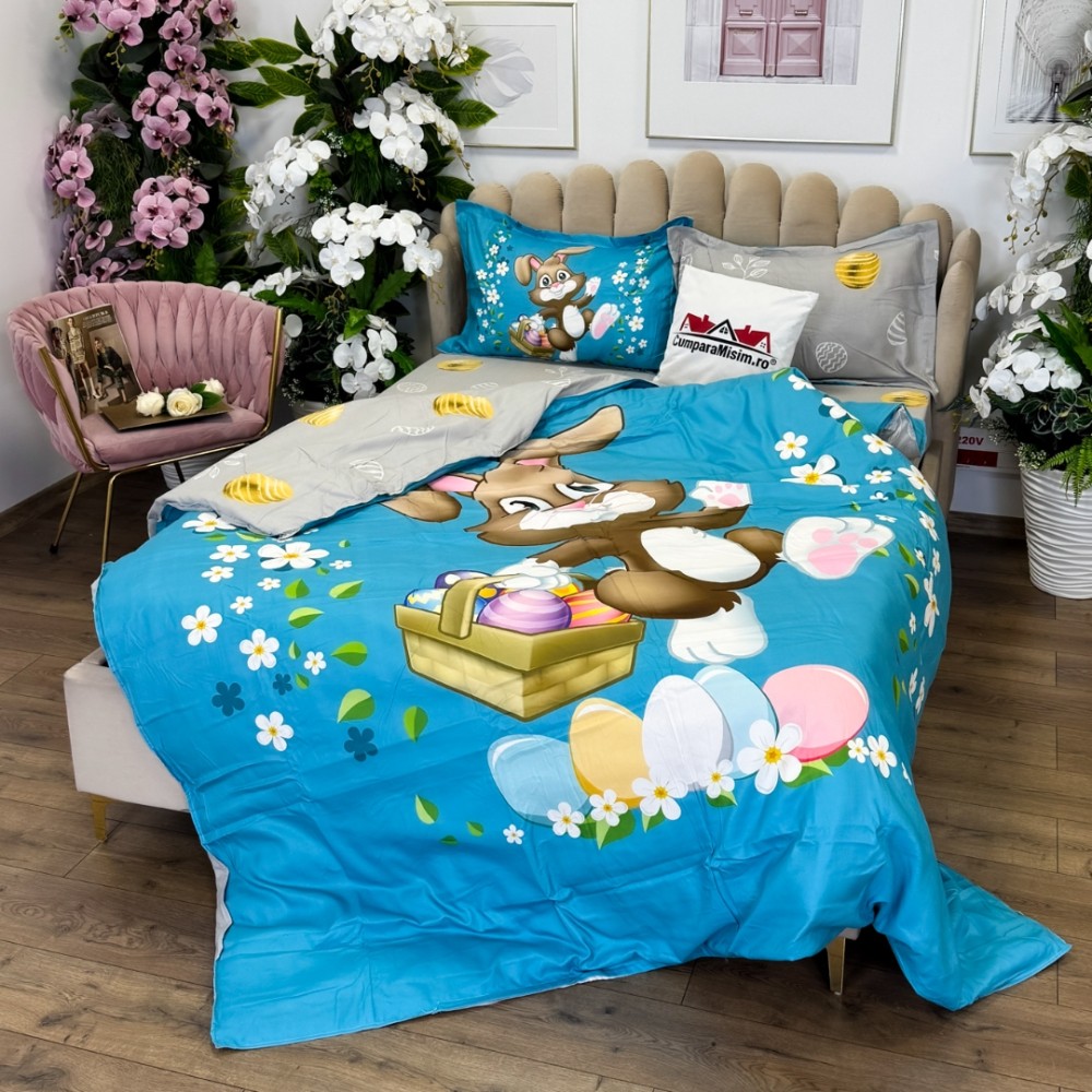 Lenjerie de Pat Dublu, Finet, Imprimeu Digital cu Iepuras si Oua, IDENTIC CU POZA, 4 Piese, Bleu, Super Design Pucioasa, cod produs: SDP-PF-31