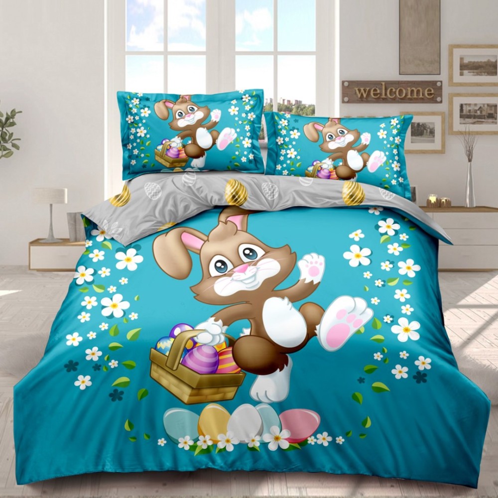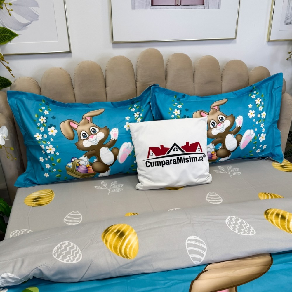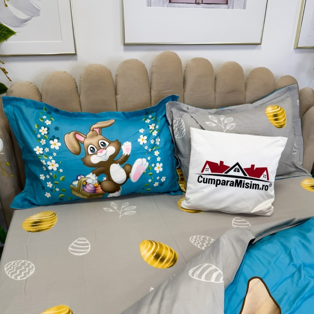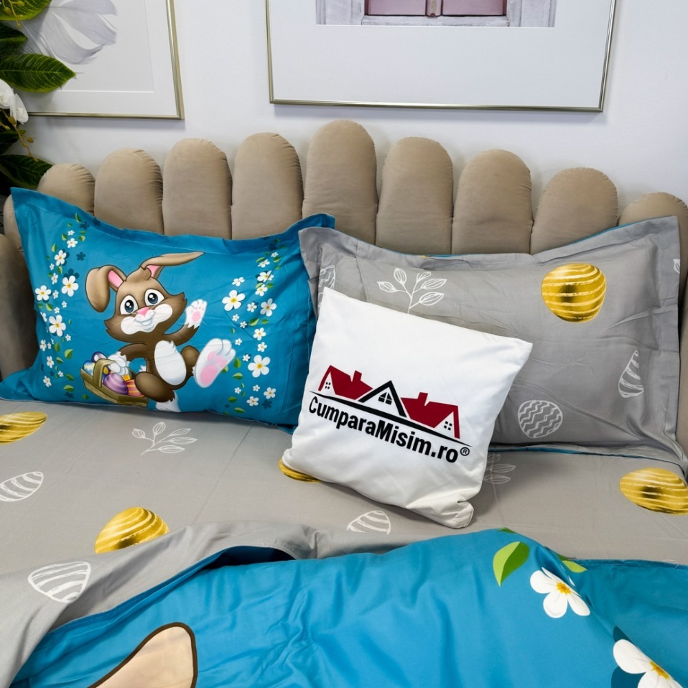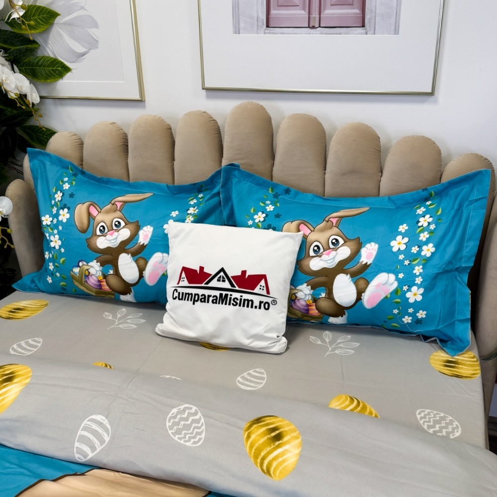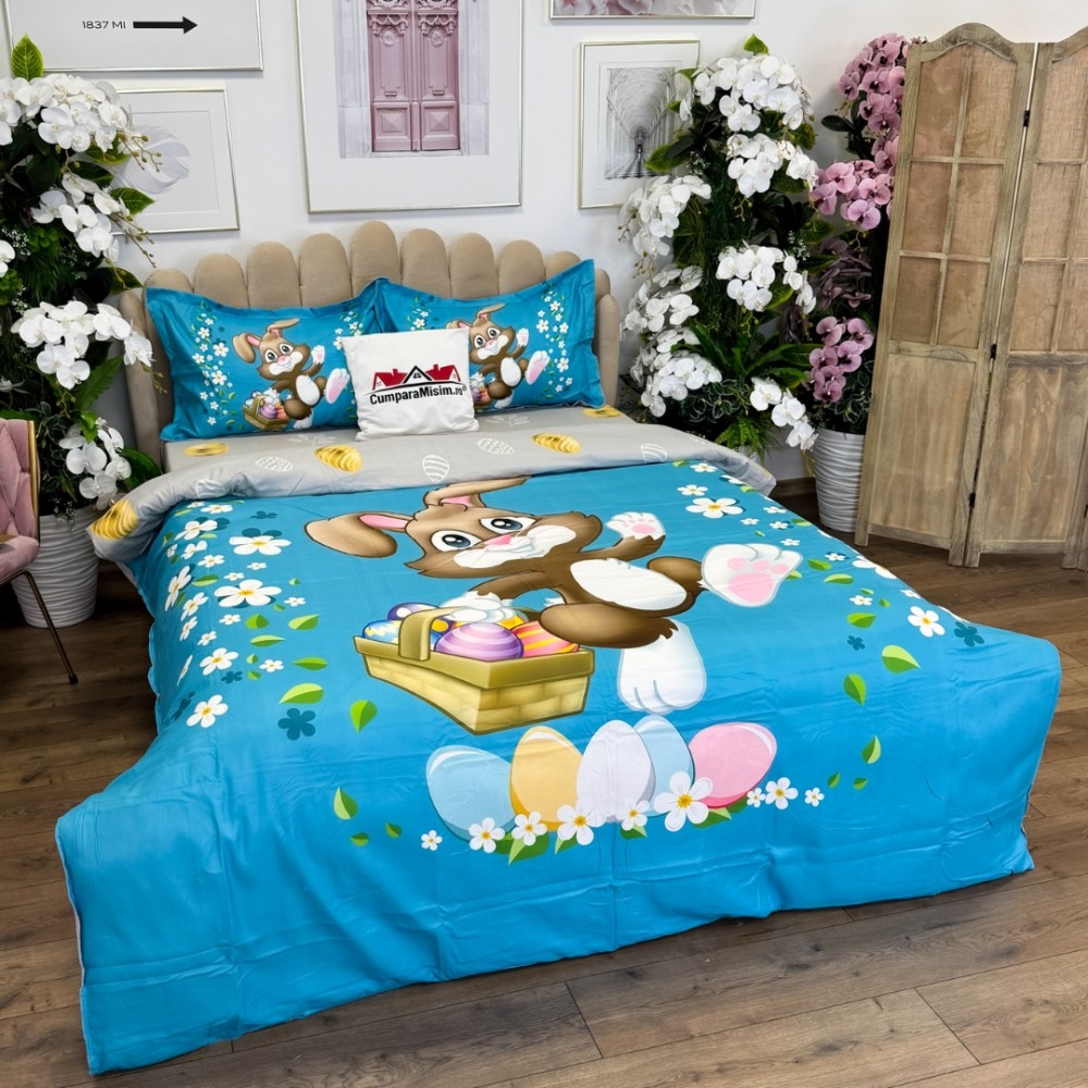 Lenjerie de Pat Dublu, Finet, Imprimeu Digital cu Iepuras si Oua, IDENTIC CU POZA, 4 Piese, Bleu, Super Design Pucioasa, cod produs: SDP-PF-31