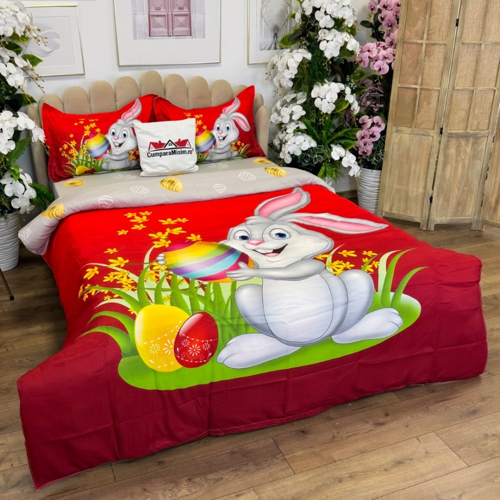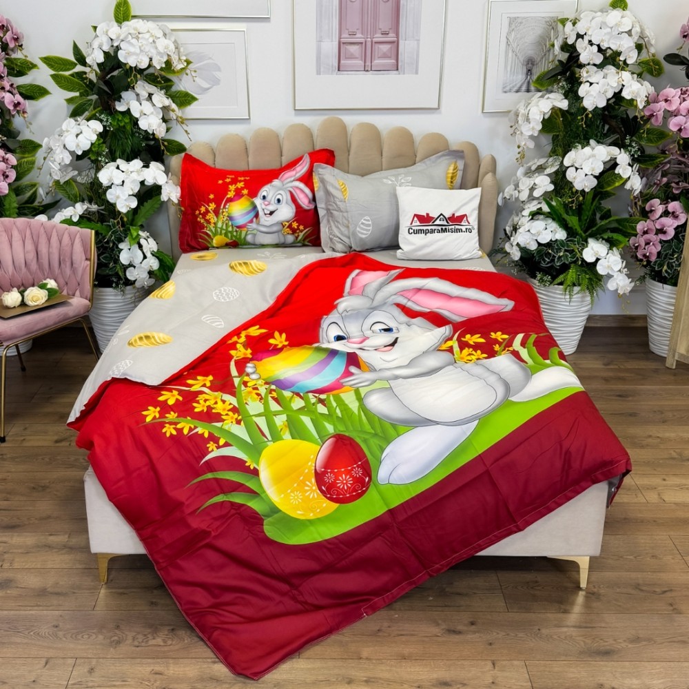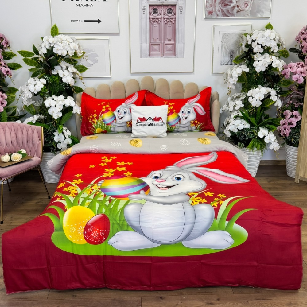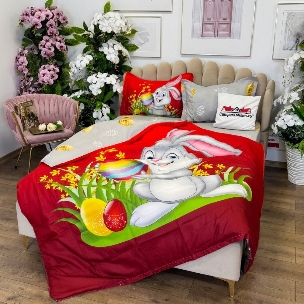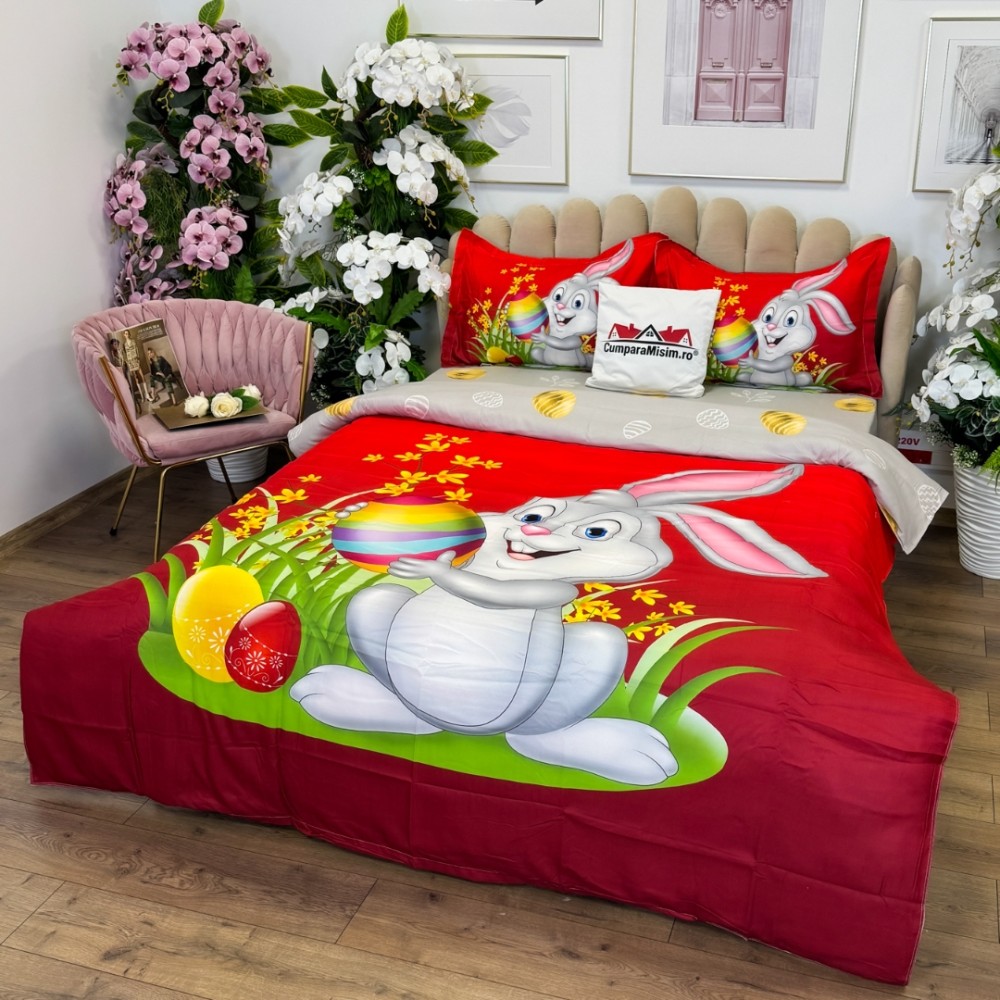Lenjerie de Pat Dublu, Finet, Imprimeu Digital cu Iepuras si Oua, IDENTIC CU POZA, 4 Piese, Rosu, Super Design Pucioasa, cod produs: SDP-PF-37