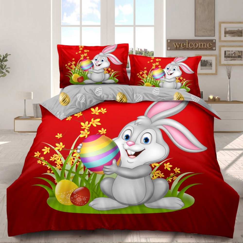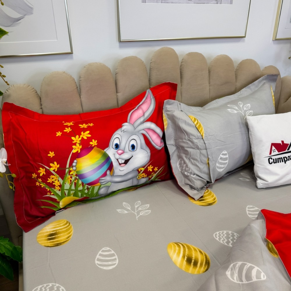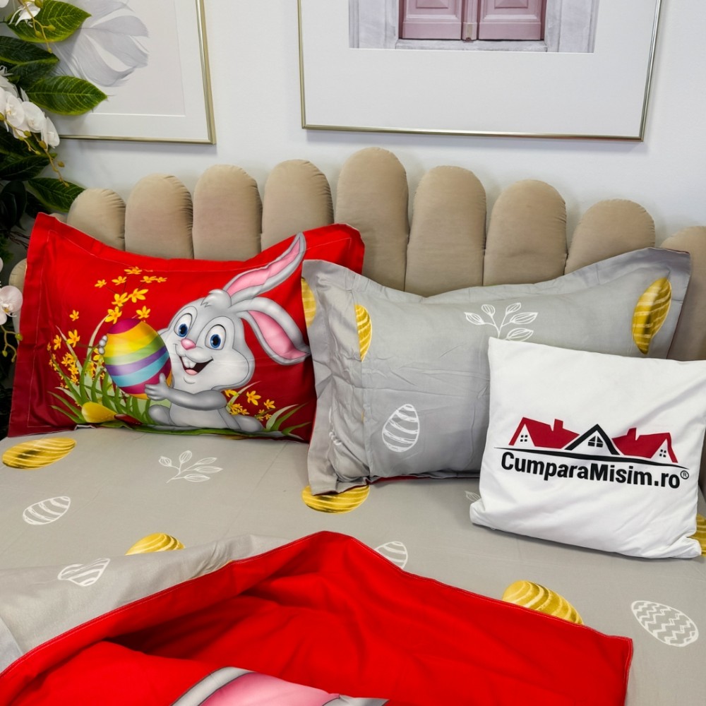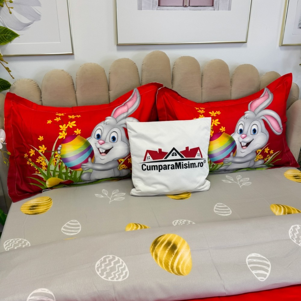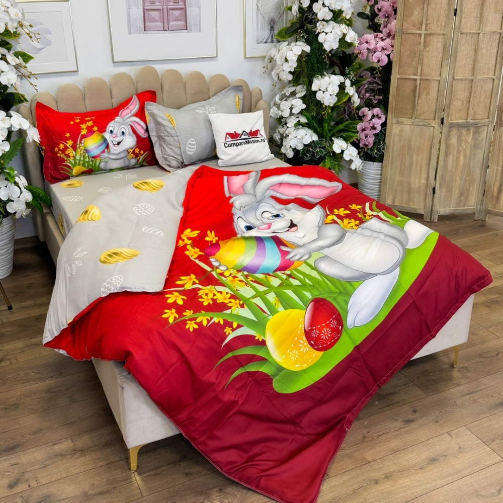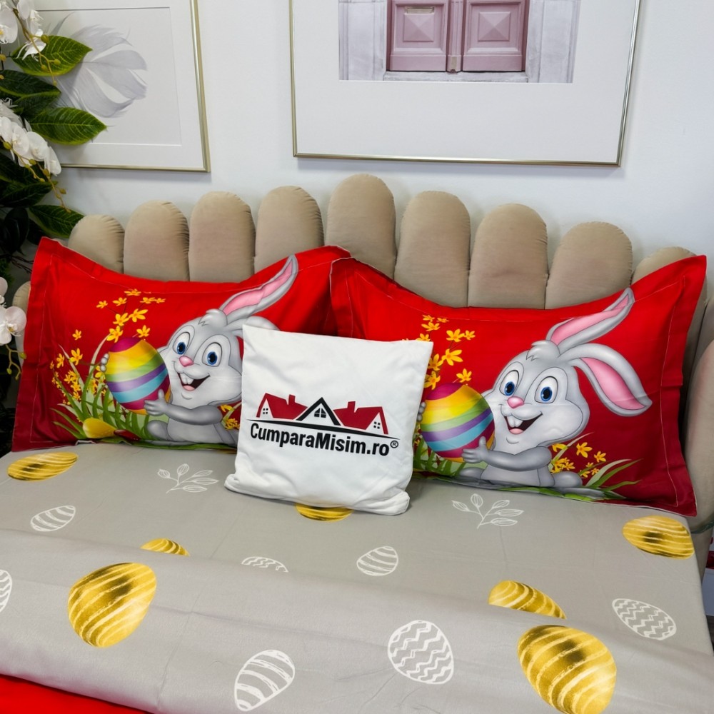 Lenjerie de Pat Dublu, Finet, Imprimeu Digital cu Iepuras si Oua, IDENTIC CU POZA, 4 Piese, Rosu, Super Design Pucioasa, cod produs: SDP-PF-37