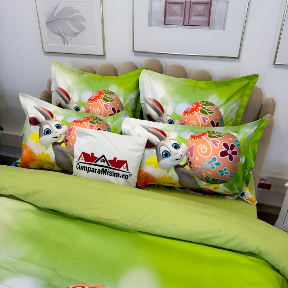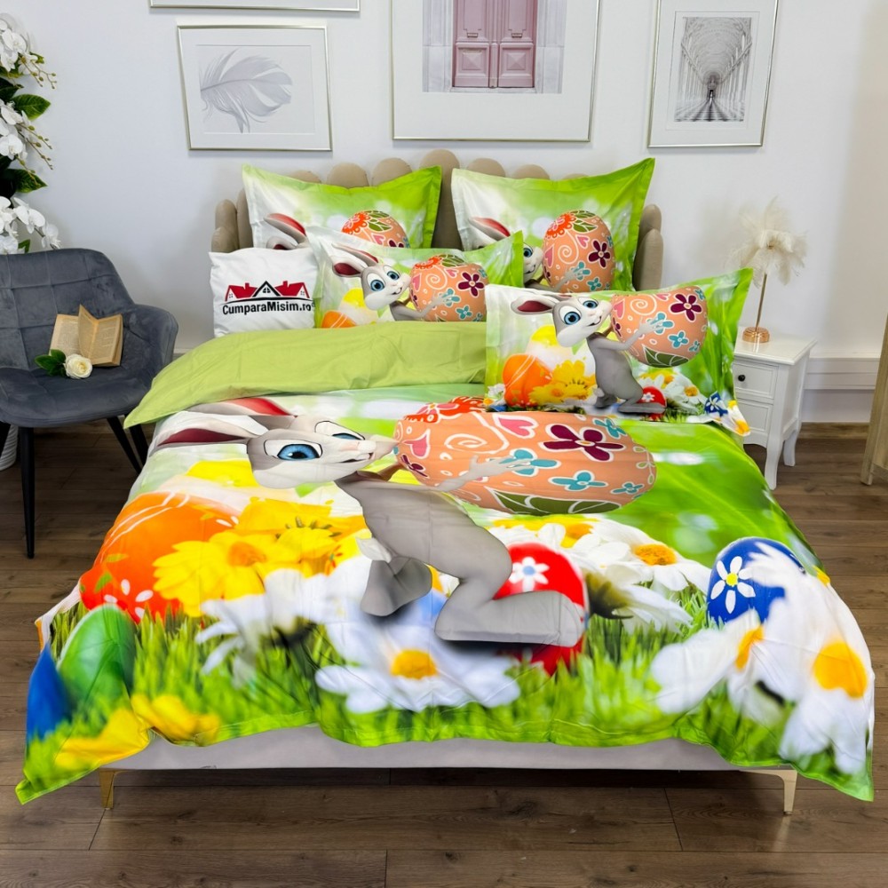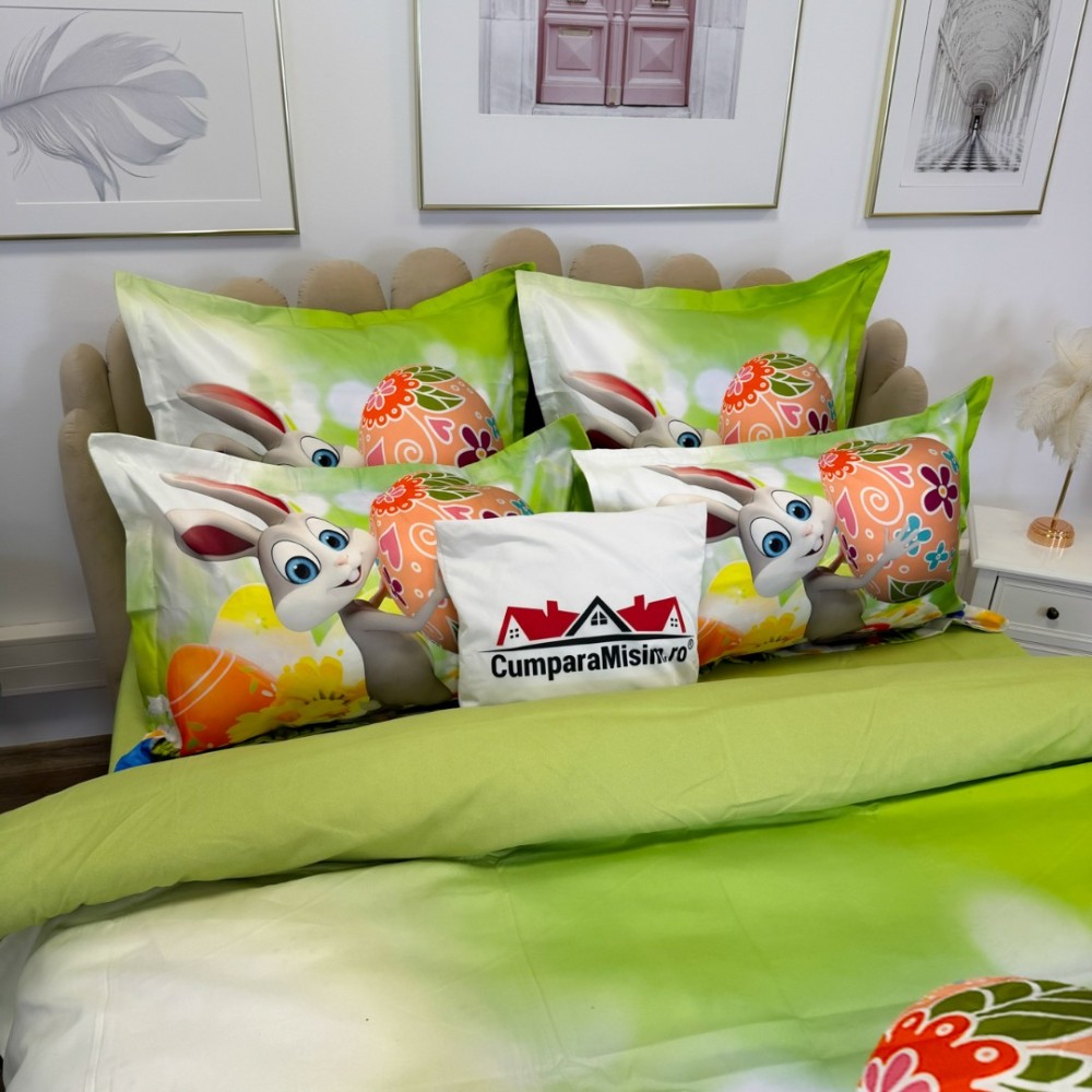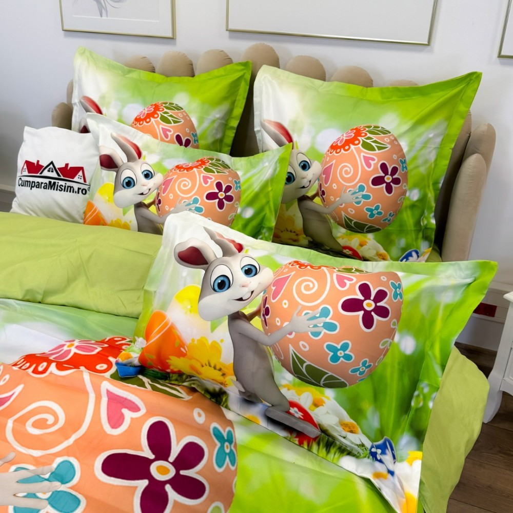 Lenjerie de Pat Dublu, Finet, Imprimeu Digital cu Iepuras si Oua, IDENTIC CU POZA, 4 Piese, Verde, Portocaliu, Super Design Pucioasa, cod produs: HRT-LP-03