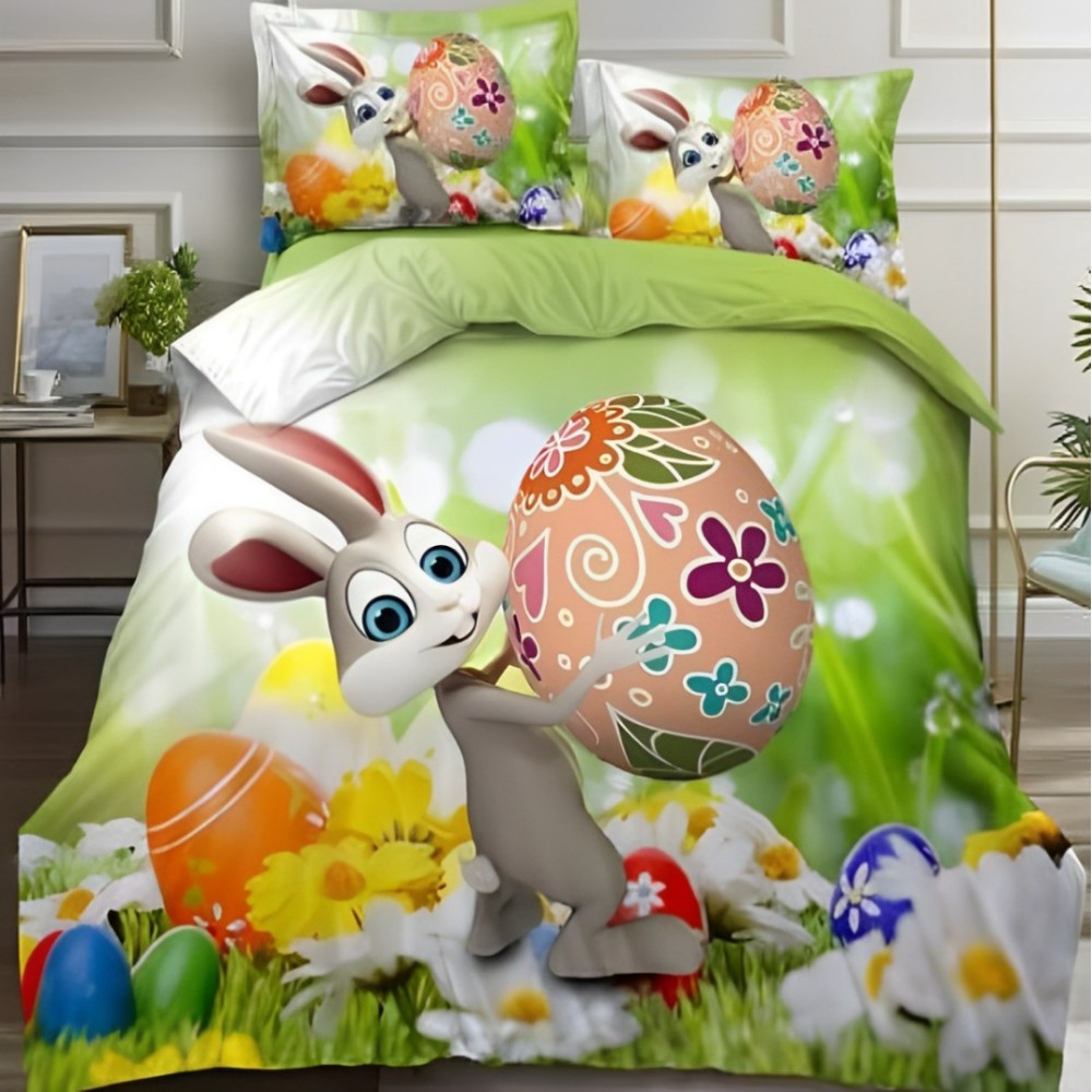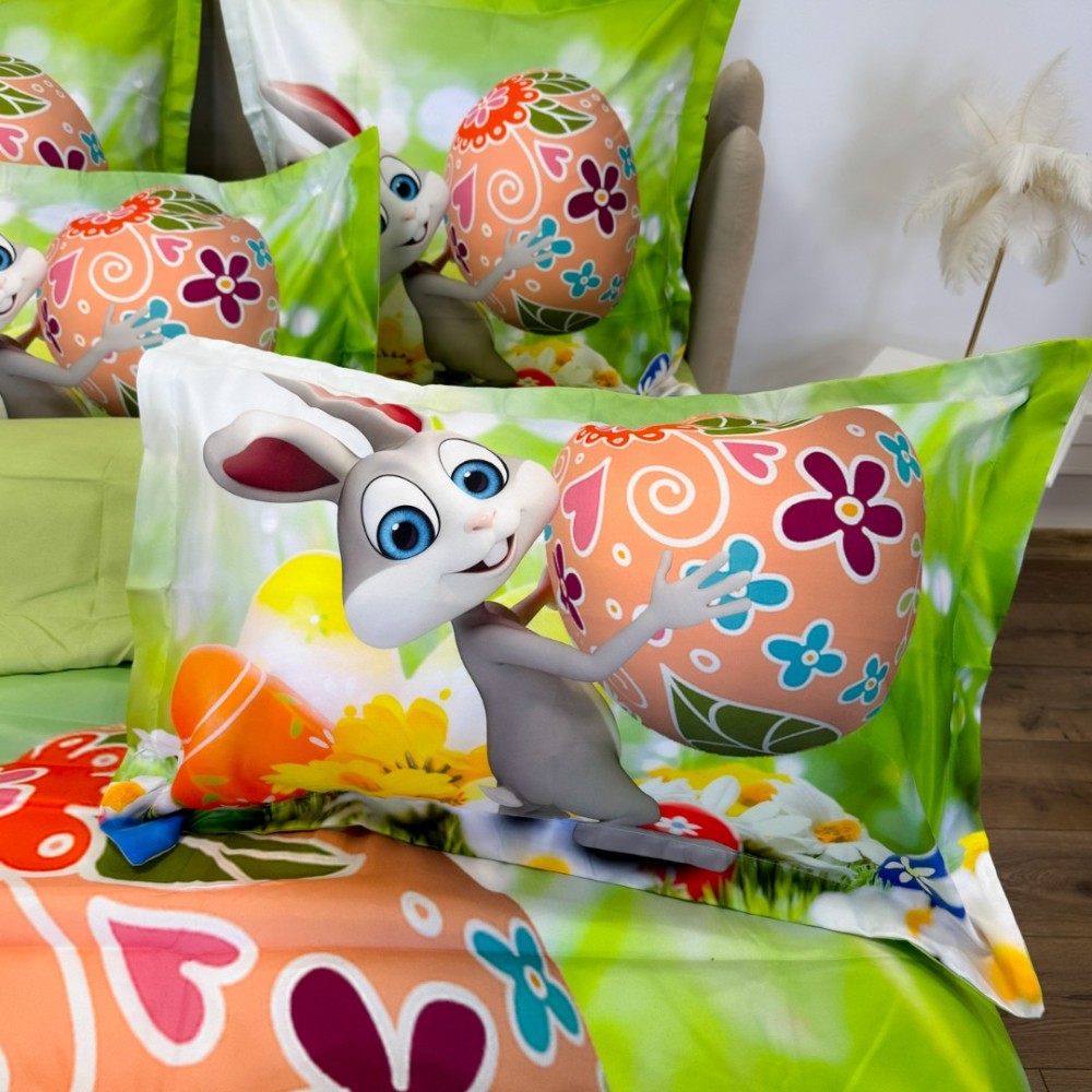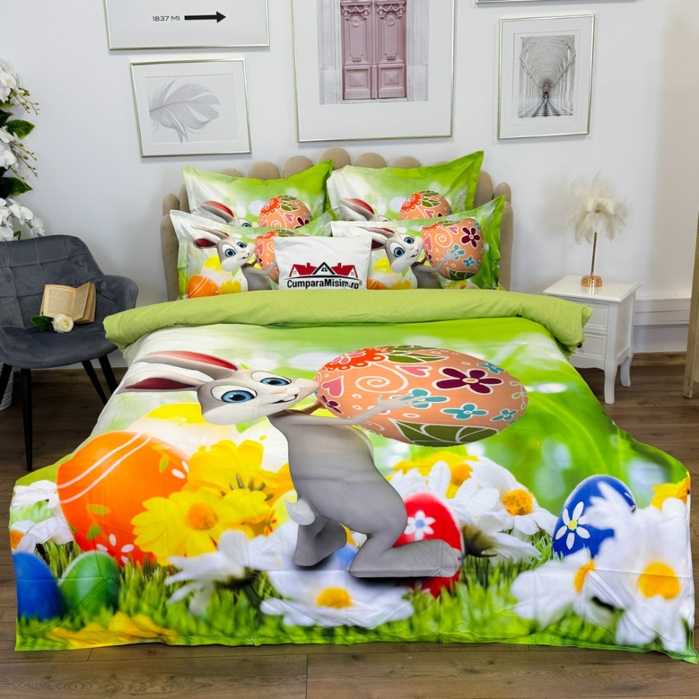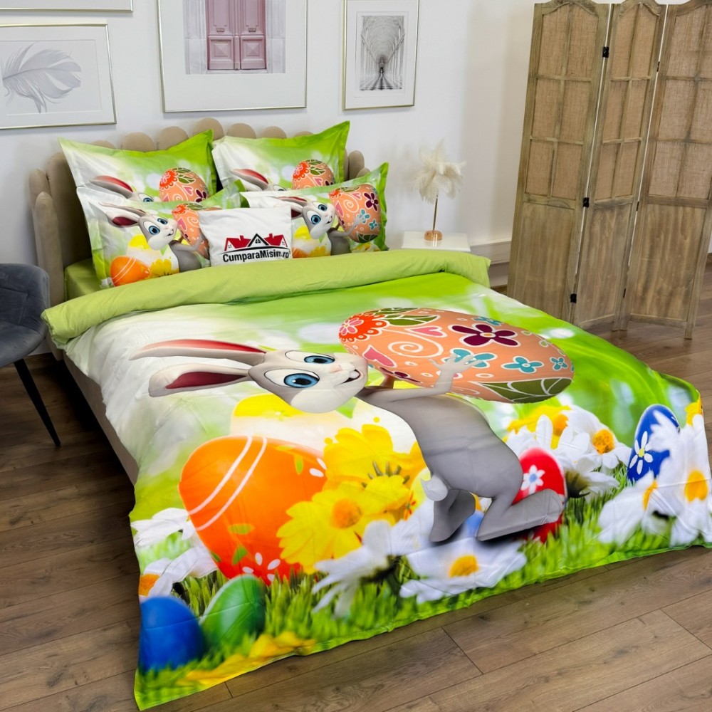 Lenjerie de Pat Dublu, Finet, Imprimeu Digital cu Iepuras si Oua, IDENTIC CU POZA, 4 Piese, Verde, Portocaliu, Super Design Pucioasa, cod produs: HRT-LP-03