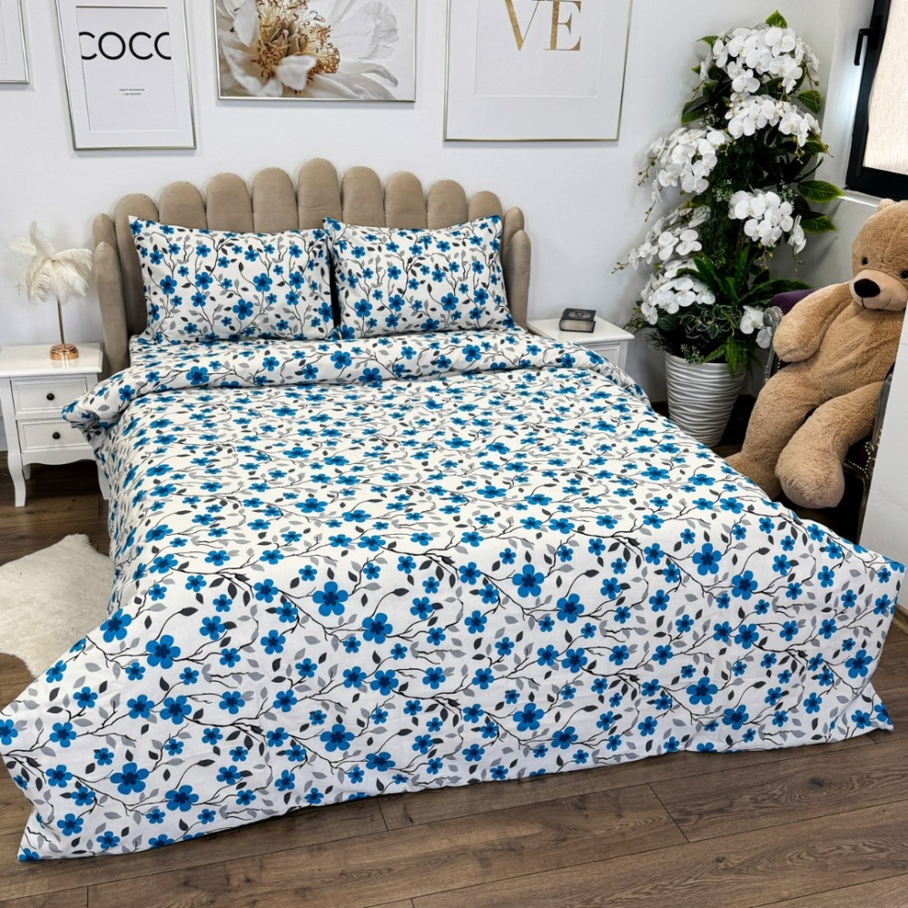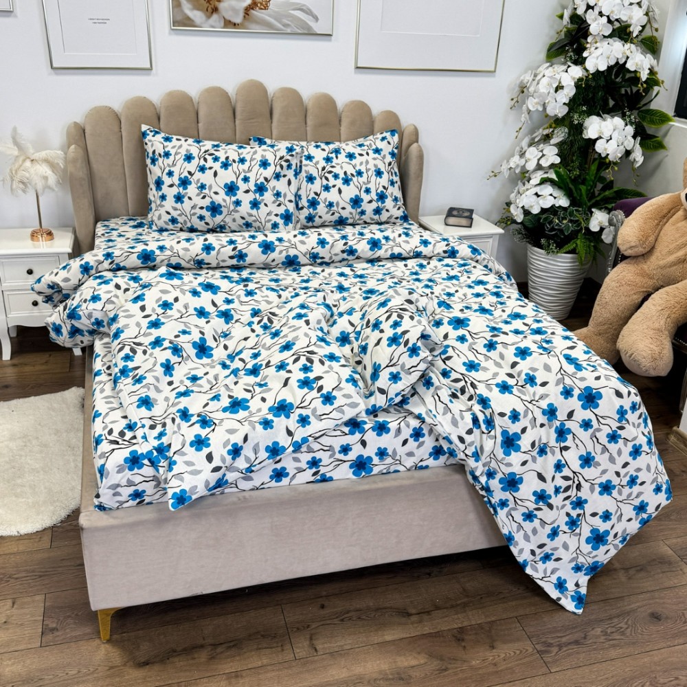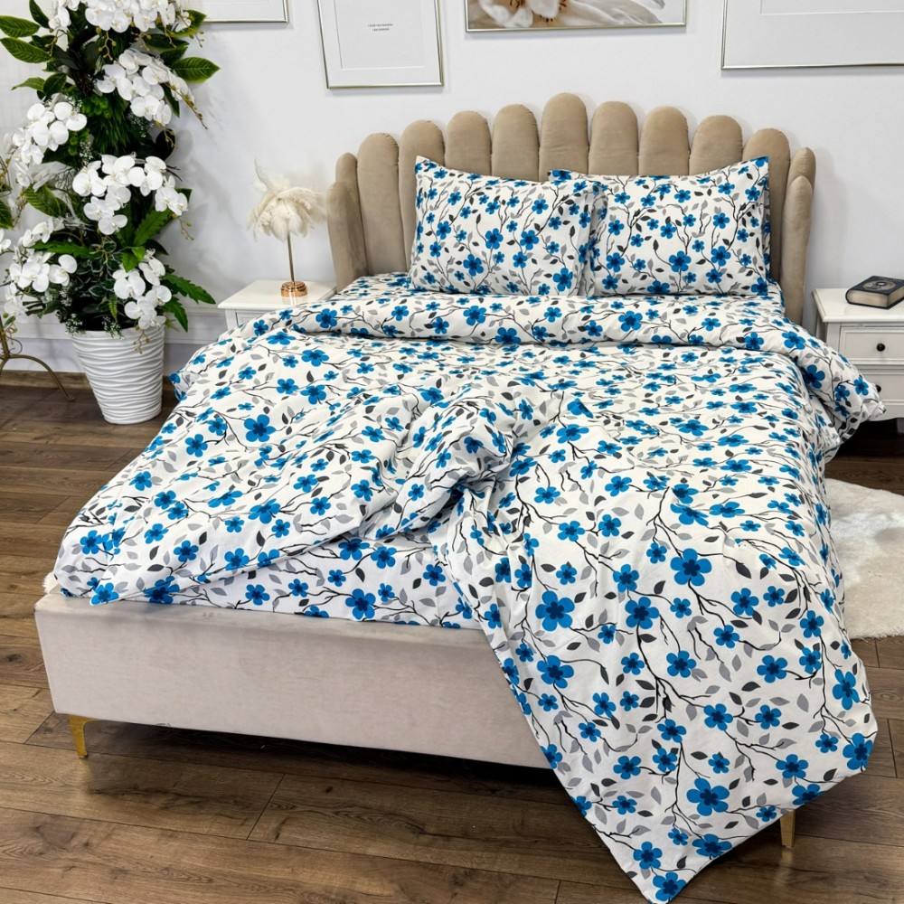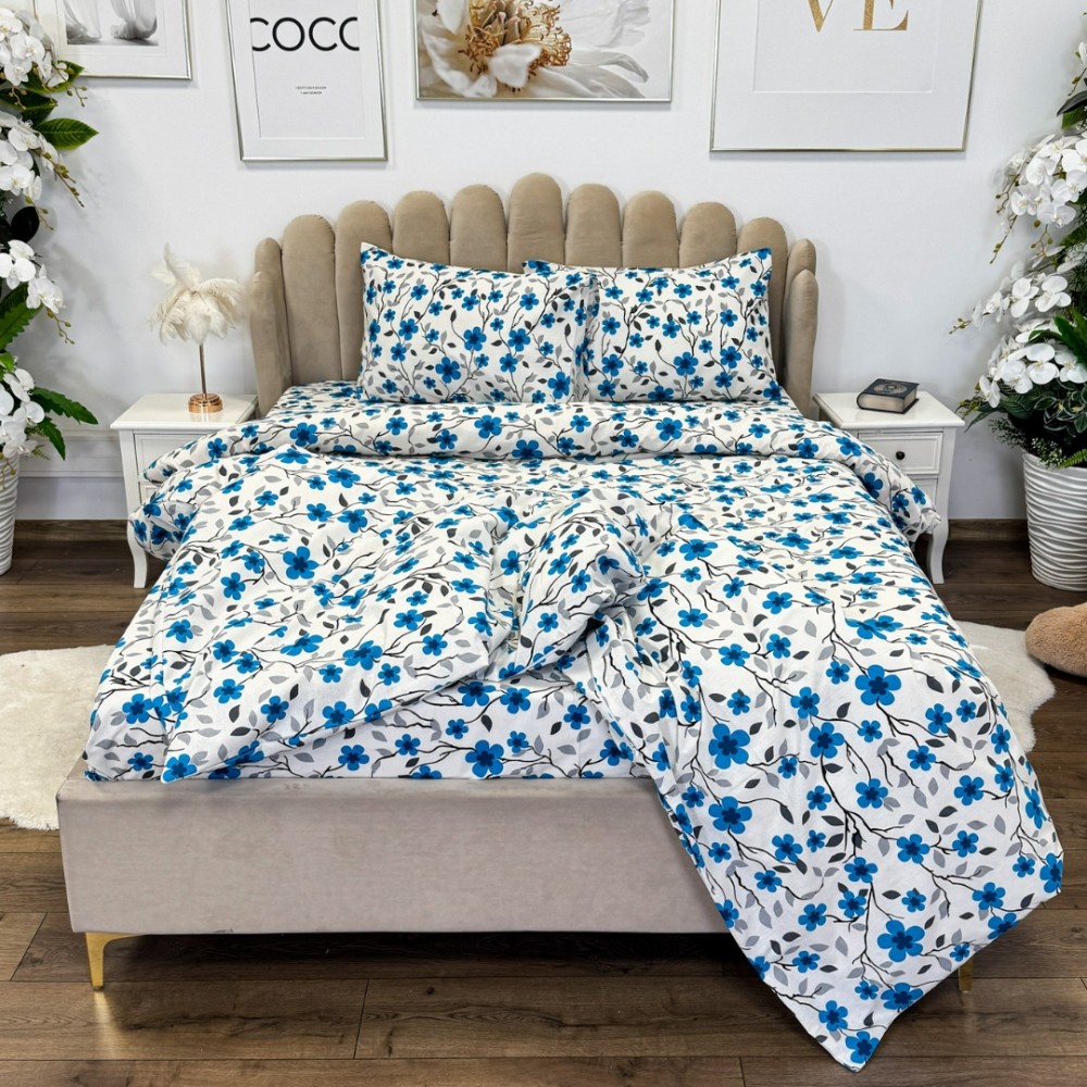 Lenjerie de Pat Dublu, Policoton Ranforsat, 4 piese, Atelier Cumparamisim, Alb, Albastru, flori, cod produs: CMP-PC21