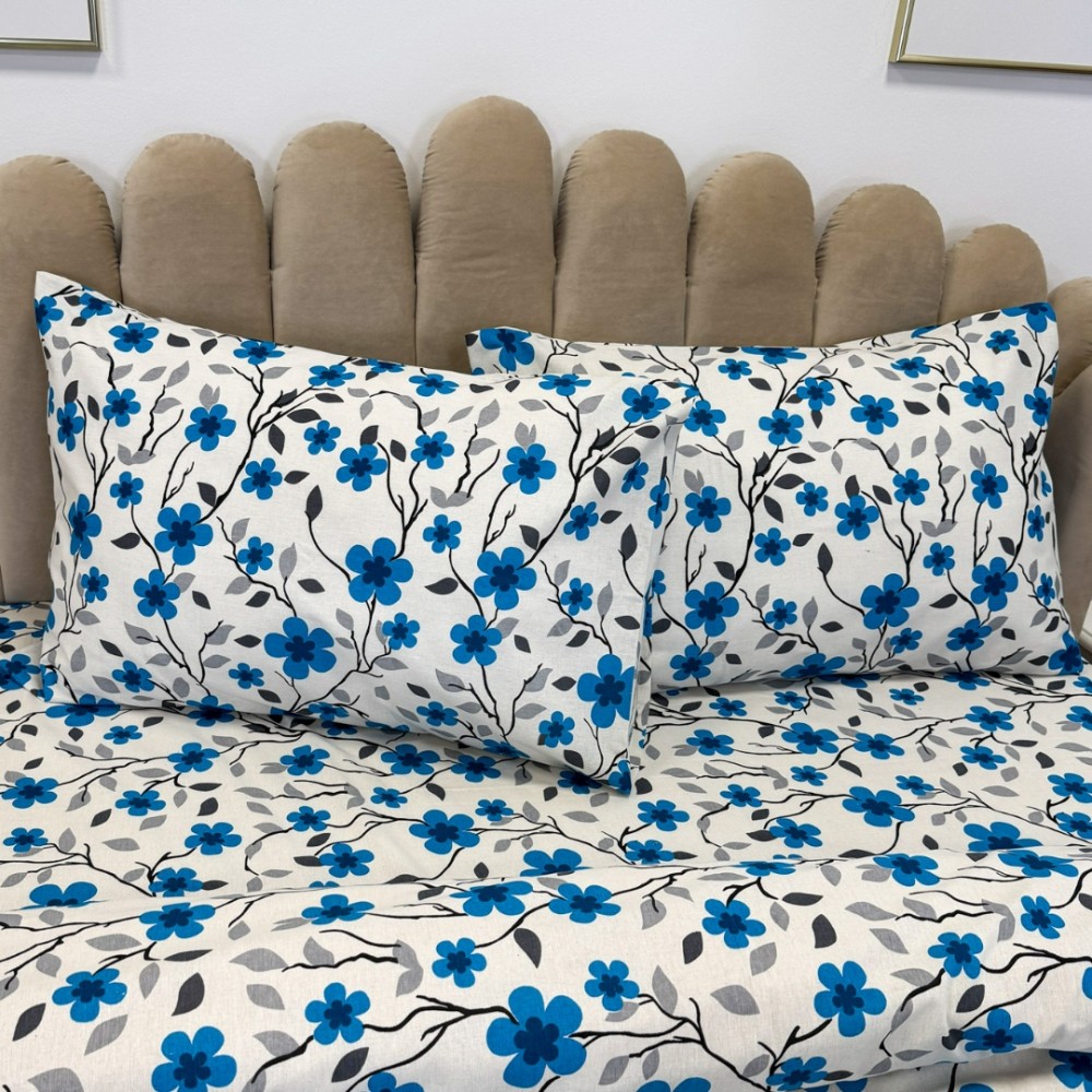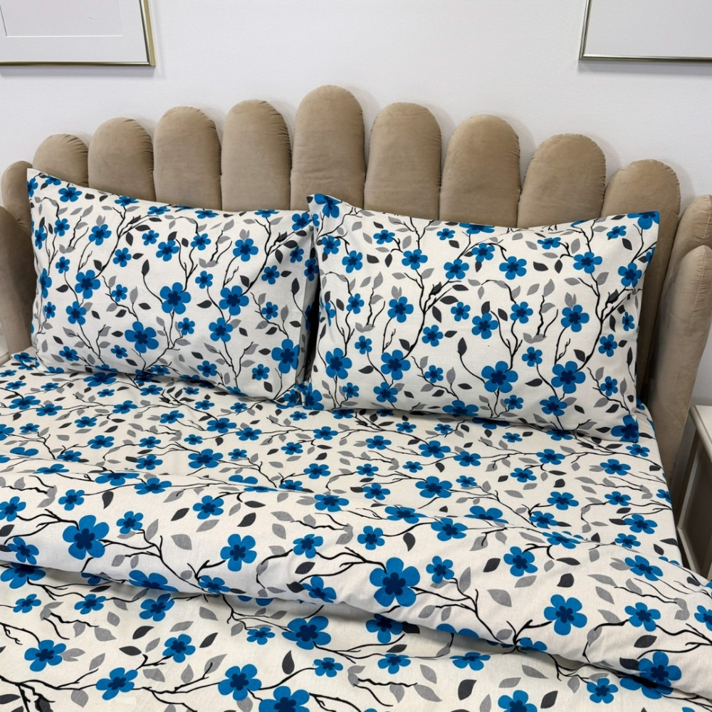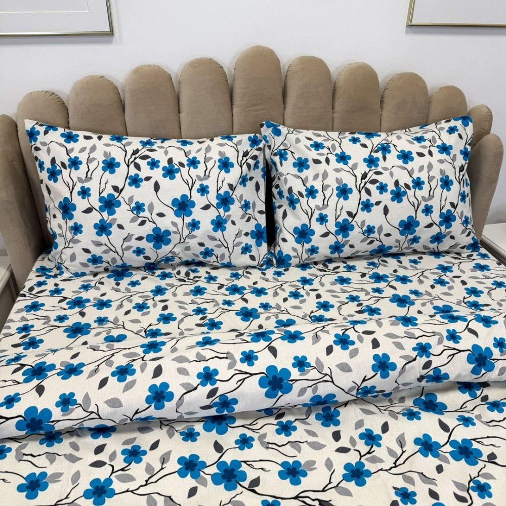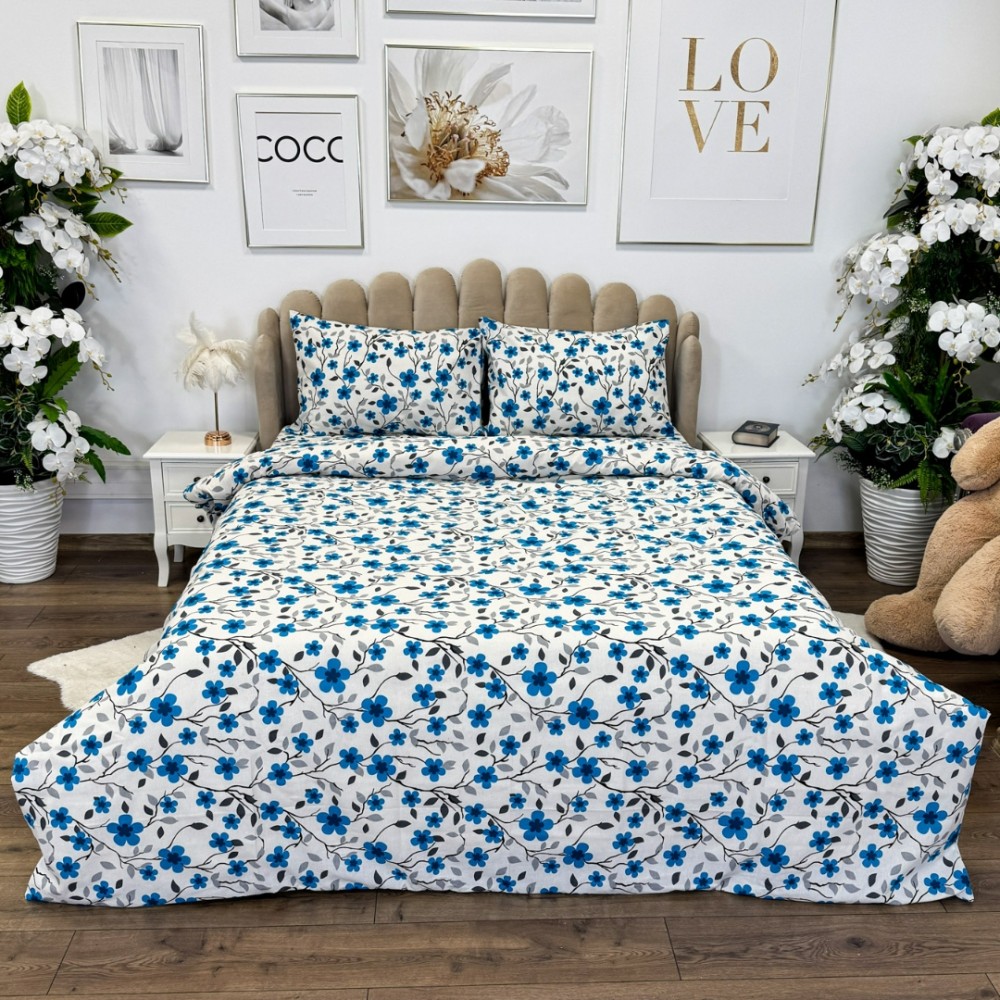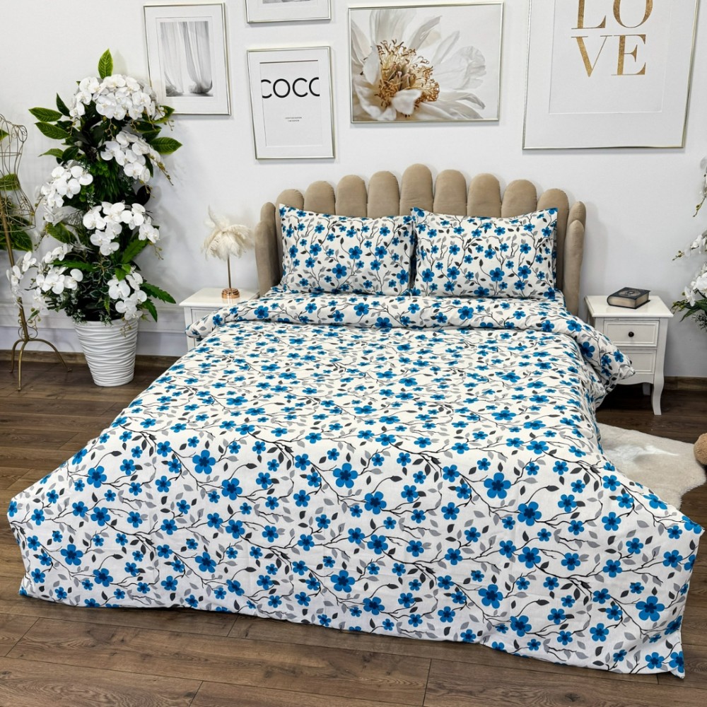 Lenjerie de Pat Dublu, Policoton Ranforsat, 4 piese, Atelier Cumparamisim, Alb, Albastru, flori, cod produs: CMP-PC21