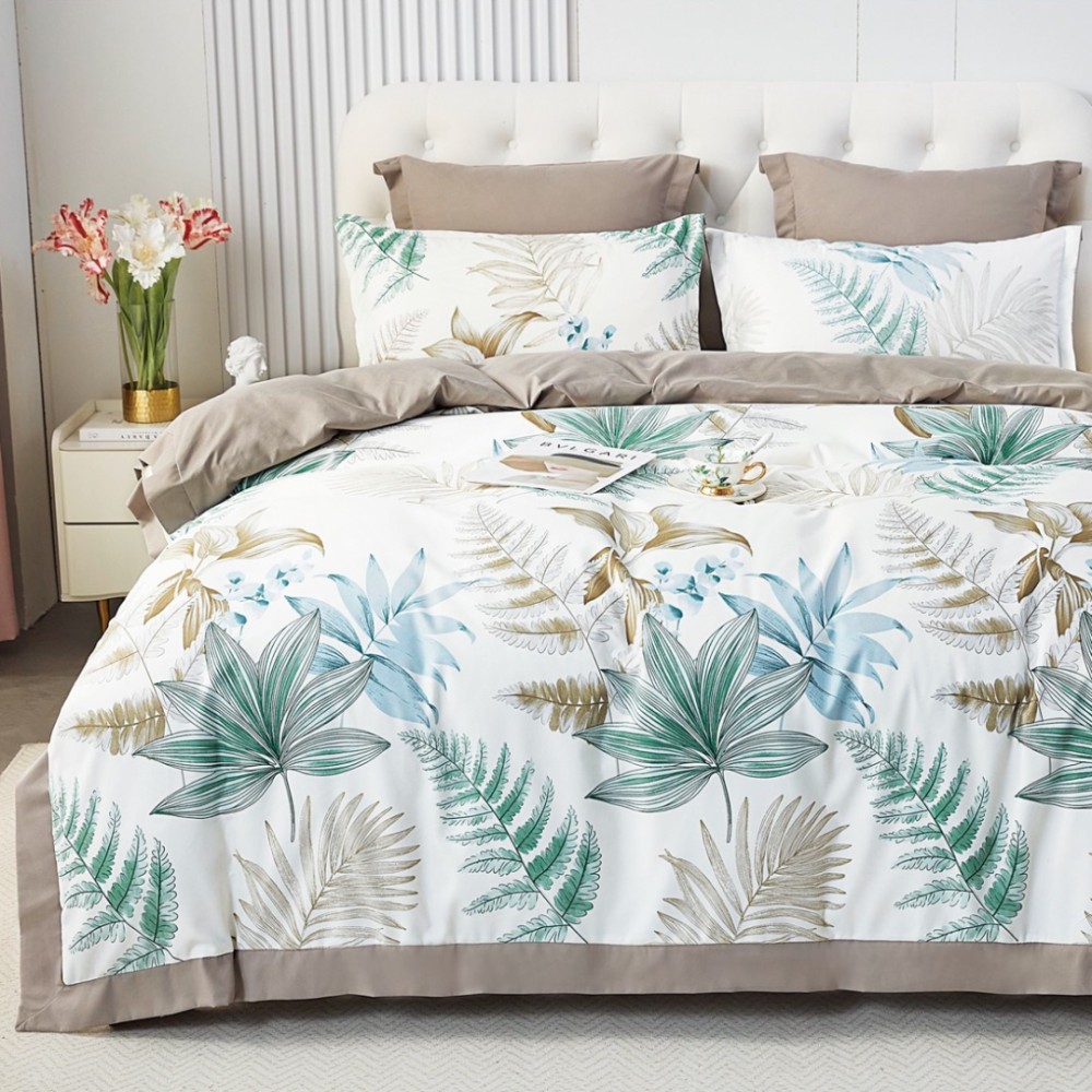 Lenjerie de Pat Dublu, Super Premium, Finet Ranforsat, 6 Piese, Ambalat în Cutie de Lux, Alb, Bej, Verde, frunze, Super Design Pucioasa, cod produs: SDP-FC29