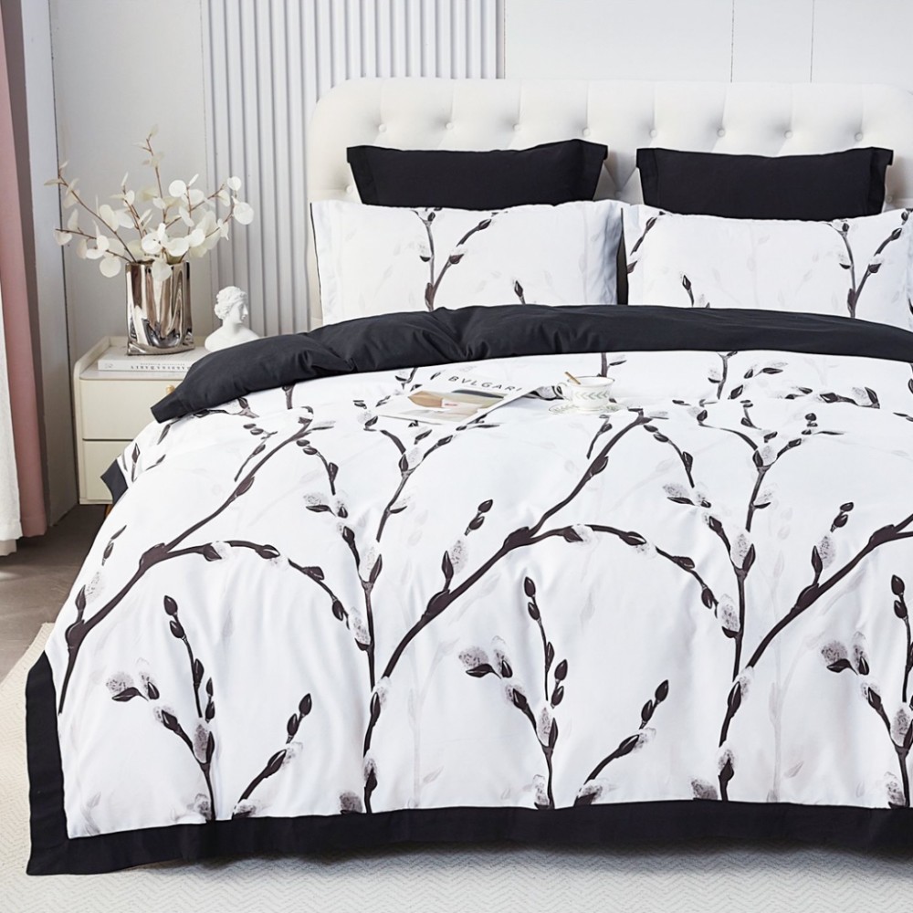 Lenjerie de Pat Dublu, Super Premium, Finet Ranforsat, 6 Piese, Ambalat în Cutie de Lux, Alb, Negru, crengute cu flori, Super Design Pucioasa, cod produs: SDP-FC26