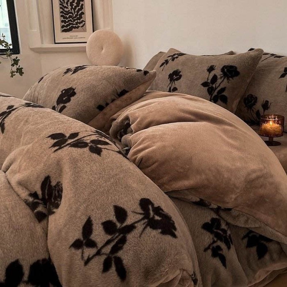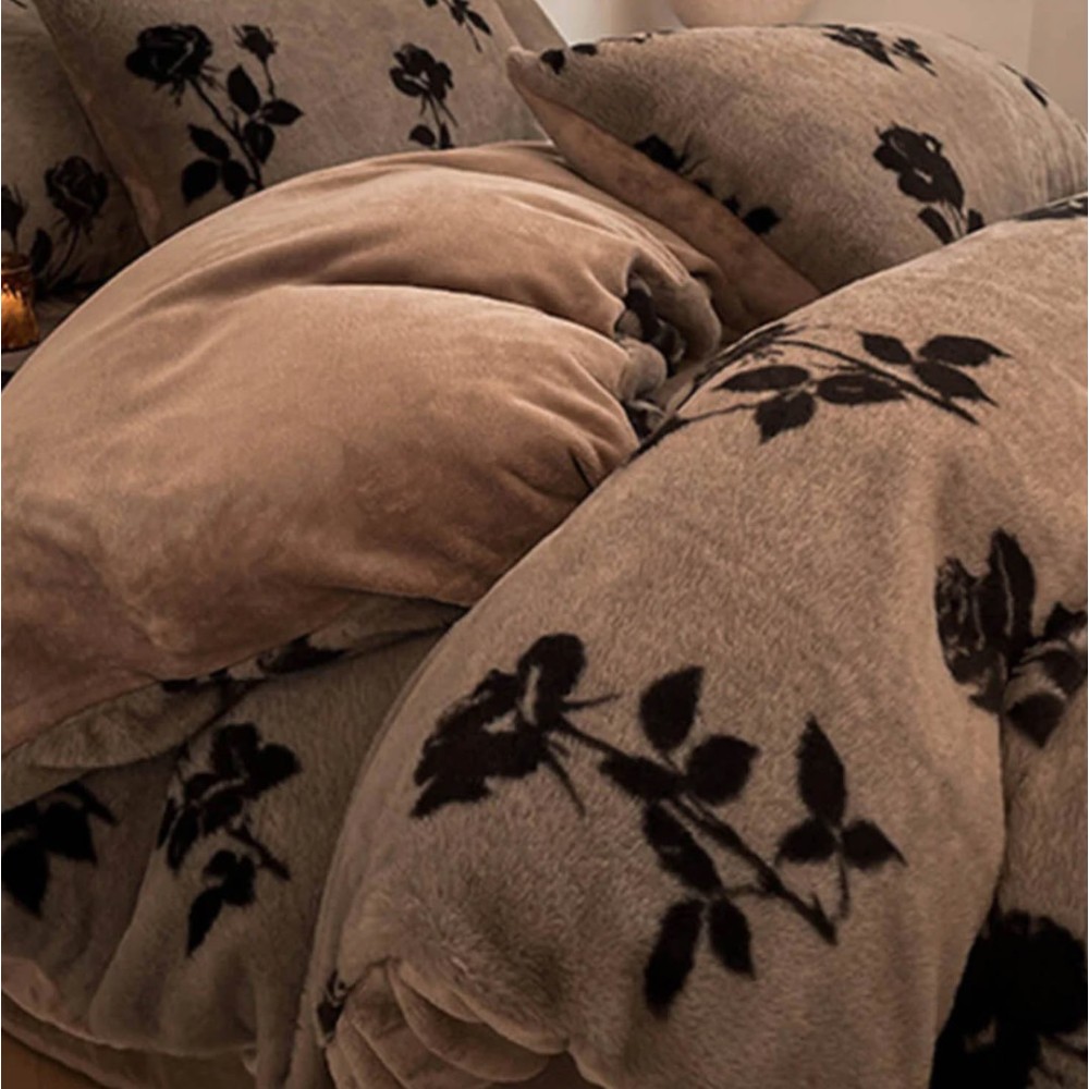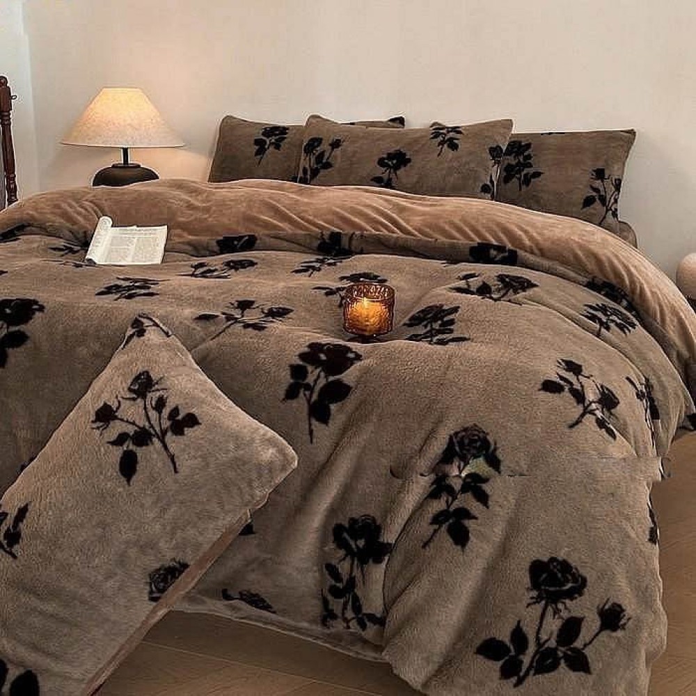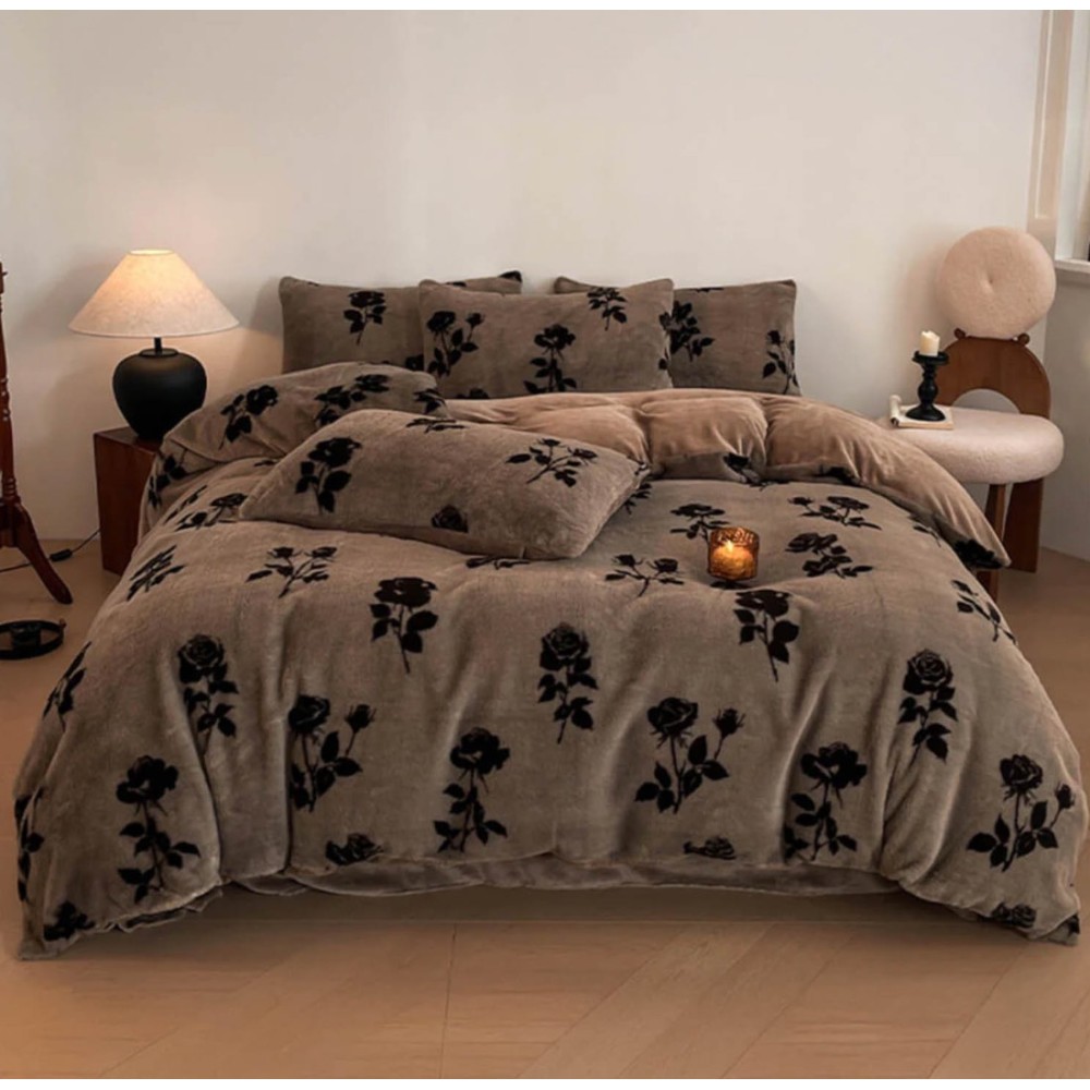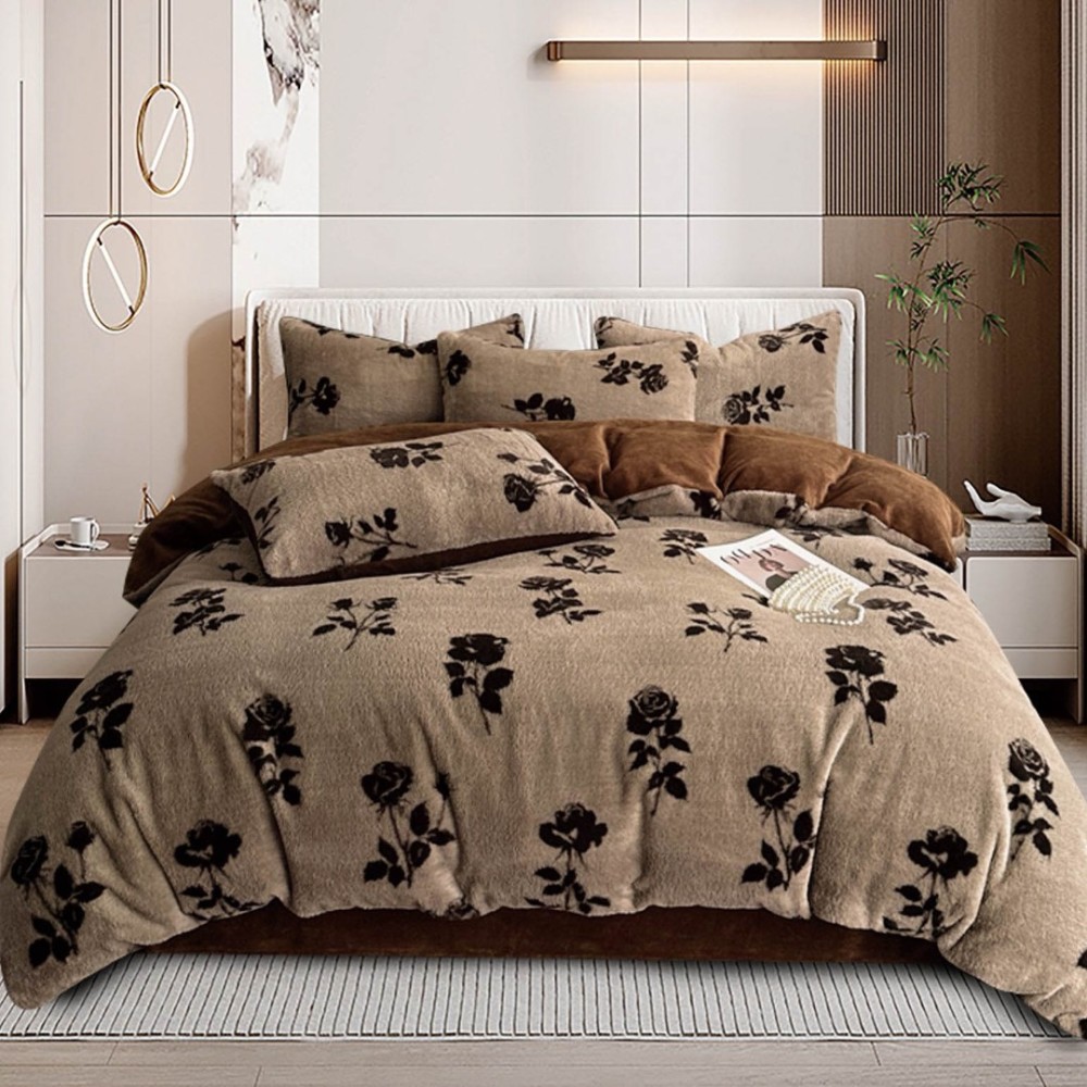 Lenjerie de Pat Premium, ExtraPufoasa, „Bunny Touch”, din Blanita Artificiala tip Iepure + CoCoLiNo Catifelat, 6 piese, Bej, Maro, Roses, cod produs: EST-TM-02