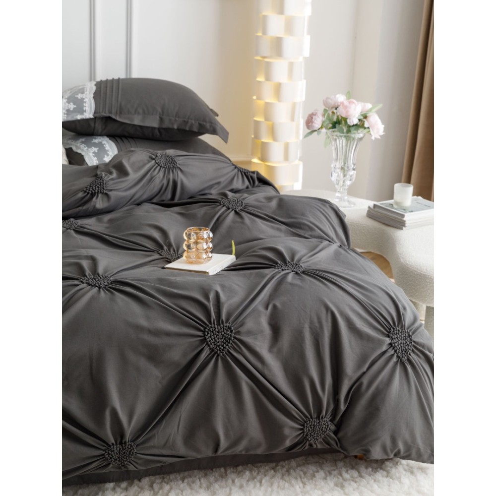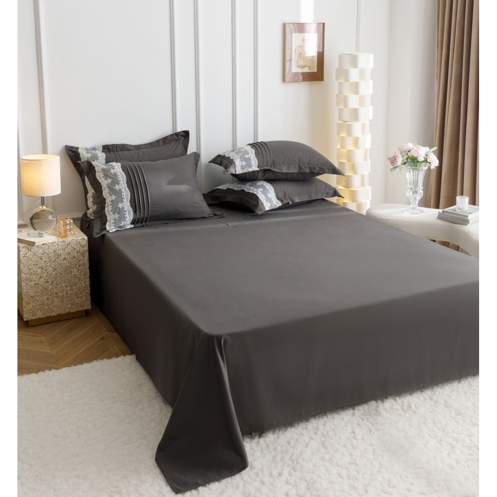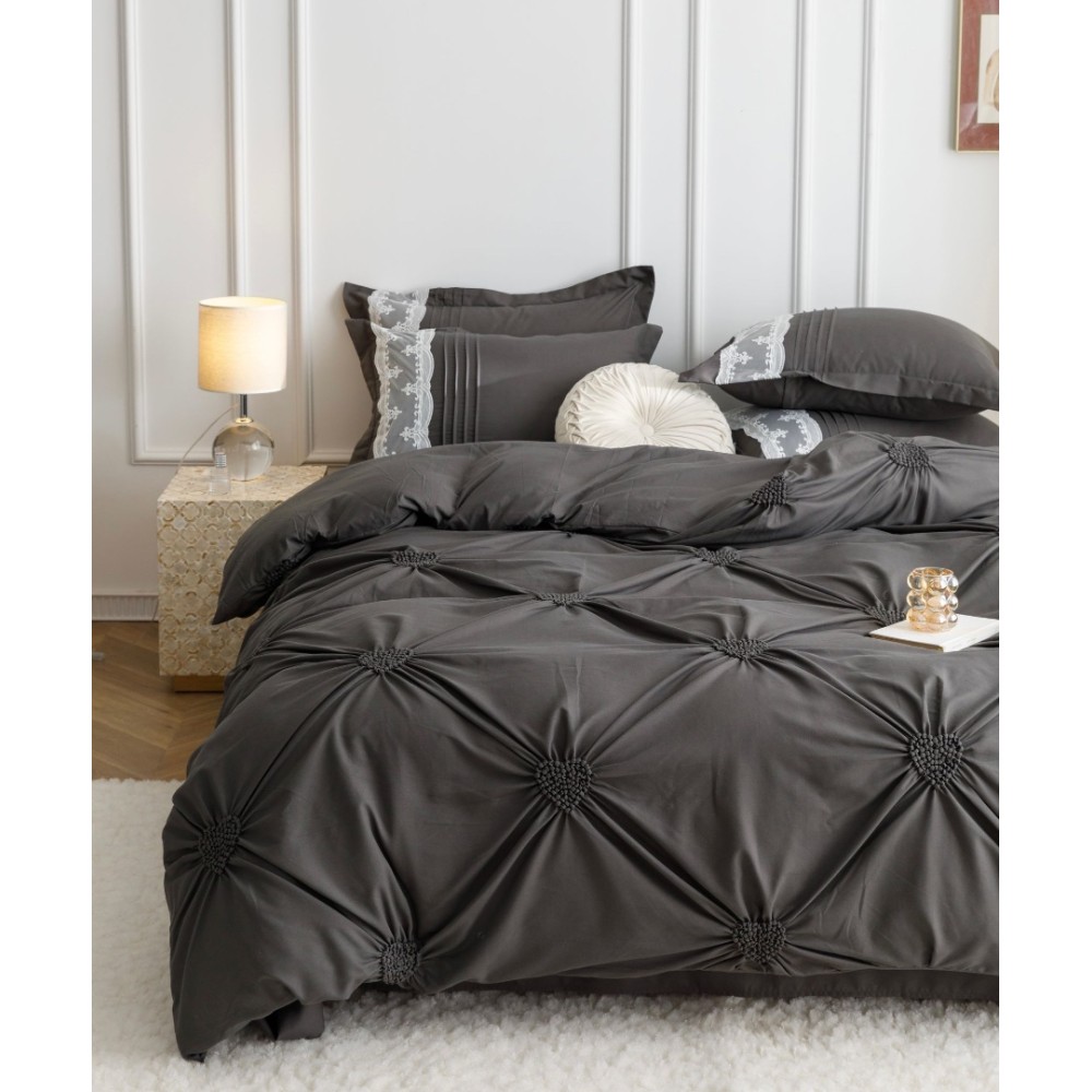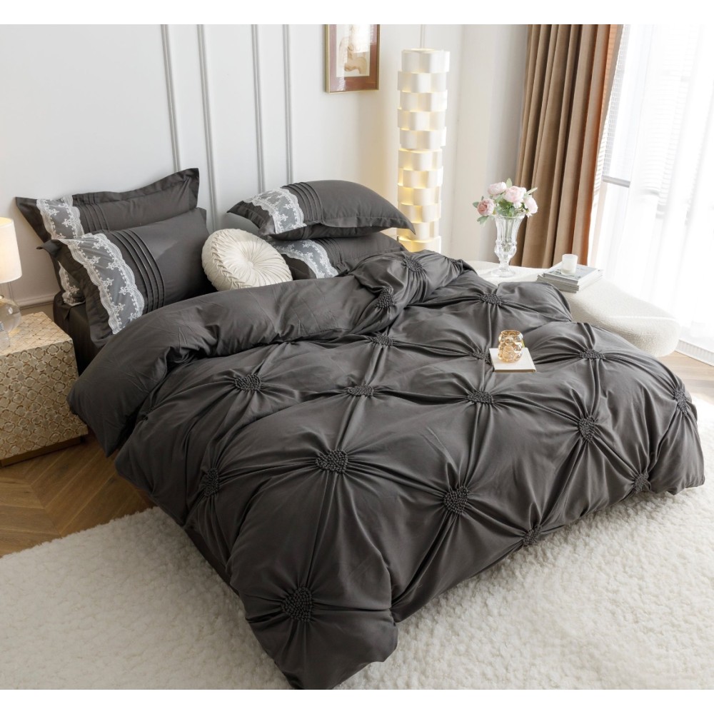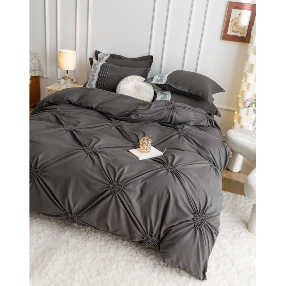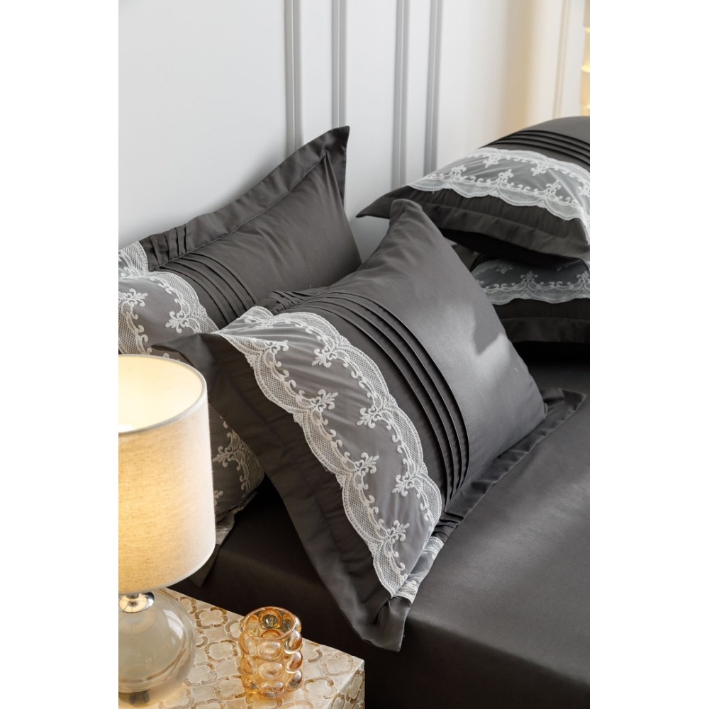 Lenjerie de Pat Premium, JOJO HOME, Finet Soft Touch, cu Inimioare din Pliuri Brodate, si Dantela Delicata, 6 Piese, Nesifonabilă și Durabilă, Gri inchis, cod produs: JOJ-PBH-06