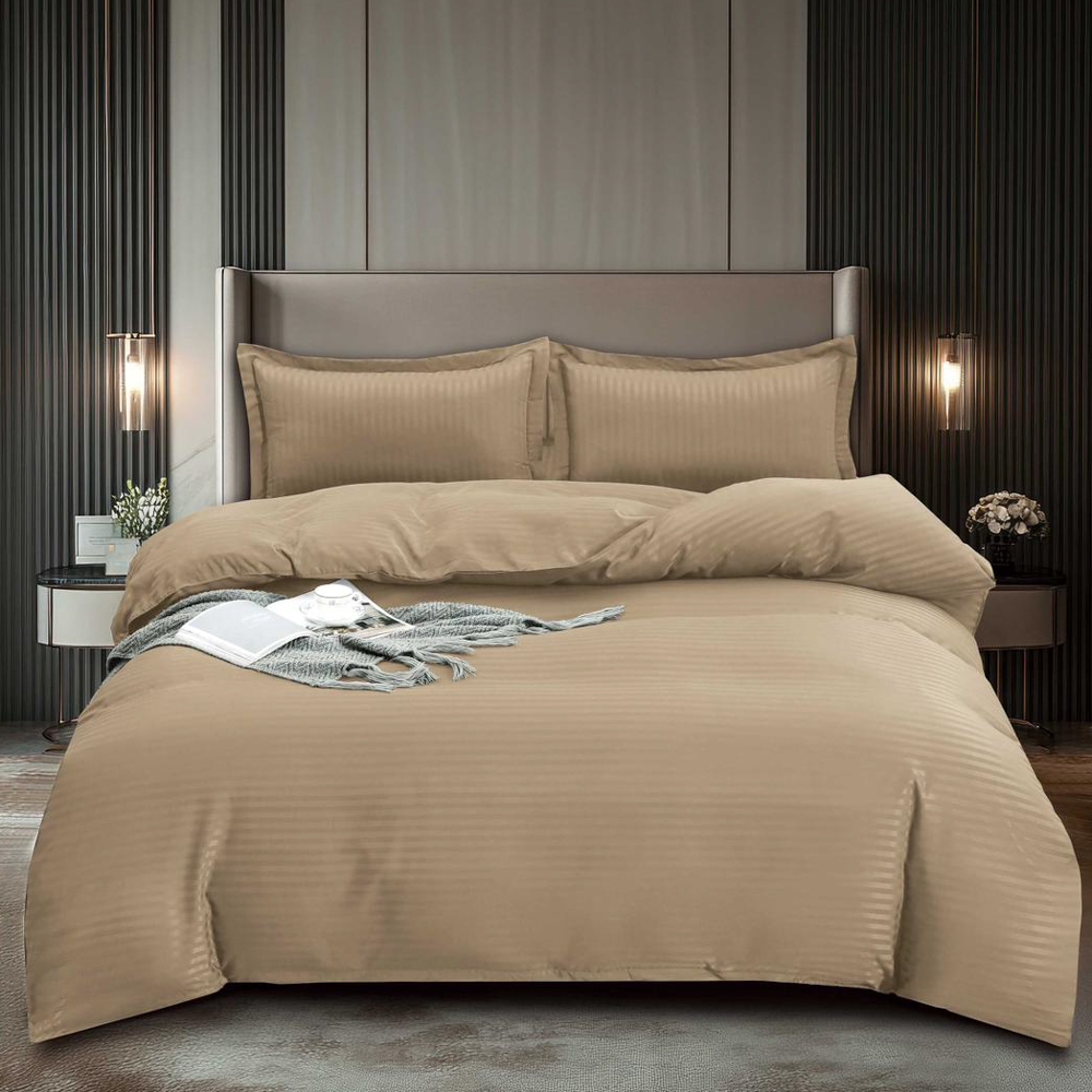 Lenjerie de pat dublu din damasc finetat, linear (tesatura din fabrica, ci nu imprimata, cu dunga de 1 cm grosime), confectionata din bumbac 70% + 30% poliester, cu 4 piese, folosita cel mai mult in regimul hotelier, datorita simplitatii si calitatii extraordinare. Materialul are un aspect usor lucios pentru o nota de eleganta si rafinament, datorita tesaturii speciale. Damascul este recunoscut pentru rezistenta sa in timp la nenumarate spalari, nemodificandu-si aspectul.