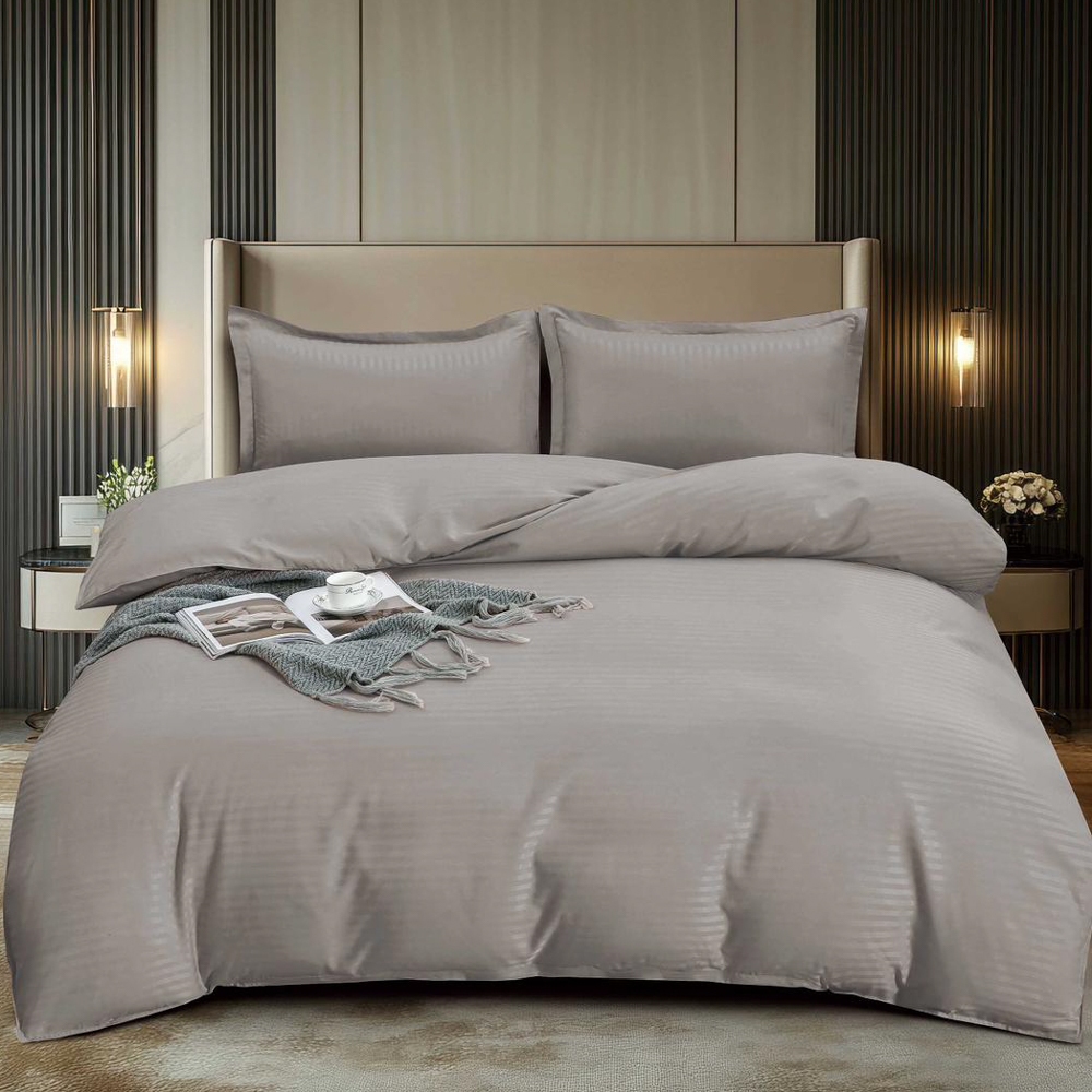 Lenjerie de pat dublu din damasc finetat, linear (tesatura din fabrica, ci nu imprimata, cu dunga de 1 cm grosime), confectionata din bumbac 70% + 30% poliester, cu 4 piese, folosita cel mai mult in regimul hotelier, datorita simplitatii si calitatii extraordinare. Materialul are un aspect usor lucios pentru o nota de eleganta si rafinament, datorita tesaturii speciale. Damascul este recunoscut pentru rezistenta sa in timp la nenumarate spalari, nemodificandu-si aspectul.