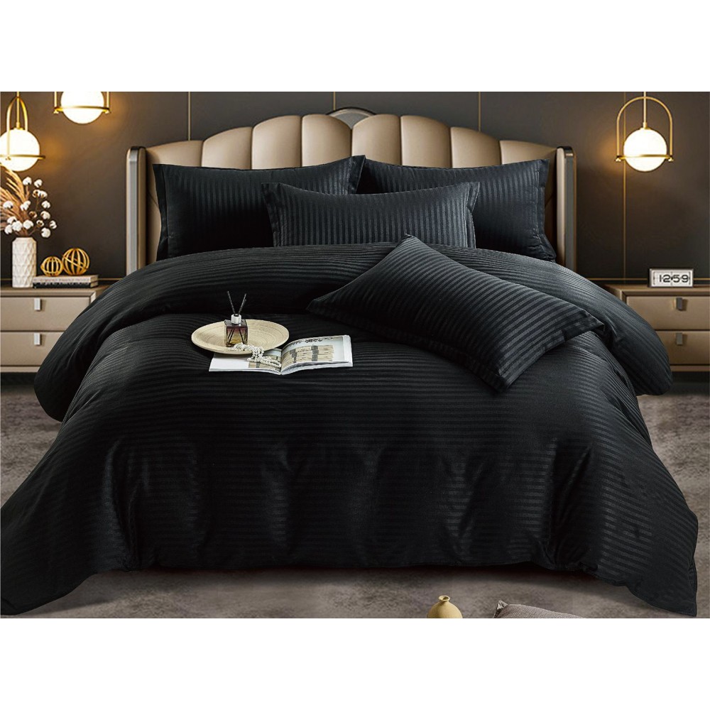 Lenjerie de pat dublu din damasc finetat, linear (tesatura din fabrica, ci nu imprimata, cu dunga de 1 cm grosime), confectionata din bumbac 70% + 30% poliester, cu 6 piese, folosita cel mai mult in regimul hotelier, datorita simplitatii si calitatii extraordinare. Materialul are un aspect usor lucios pentru o nota de eleganta si rafinament, datorita tesaturii speciale. Damascul este recunoscut pentru rezistenta sa in timp la nenumarate spalari, nemodificandu-si aspectul.