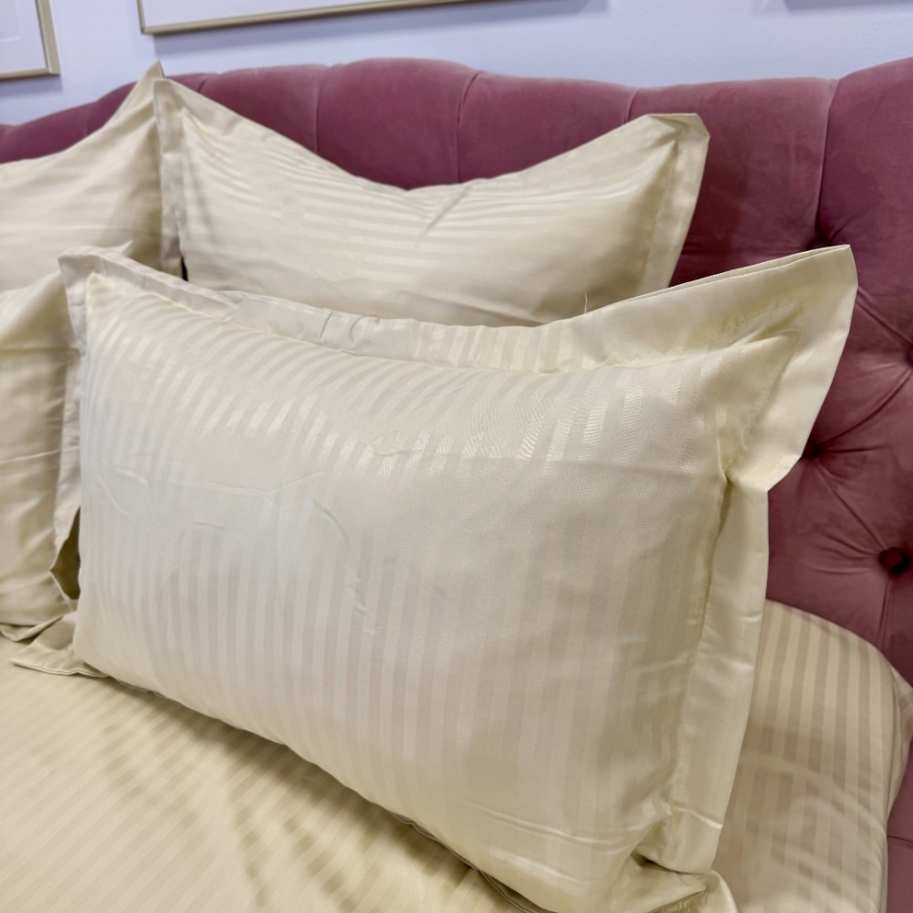 Lenjerie de pat dublu din damasc finetat, linear (tesatura din fabrica, ci nu imprimata, cu dunga de 1 cm grosime), confectionata din bumbac 70% + 30% poliester, cu 6 piese, folosita cel mai mult in regimul hotelier, datorita simplitatii si calitatii extraordinare. Materialul are un aspect usor lucios pentru o nota de eleganta si rafinament, datorita tesaturii speciale. Damascul este recunoscut pentru rezistenta sa in timp la nenumarate spalari, nemodificandu-si aspectul.