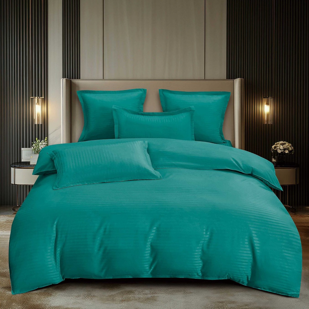 Lenjerie de pat dublu din damasc finetat, linear (tesatura din fabrica, ci nu imprimata, cu dunga de 1 cm grosime), confectionata din bumbac 70% + 30% poliester, cu 6 piese, folosita cel mai mult in regimul hotelier, datorita simplitatii si calitatii extraordinare. Materialul are un aspect usor lucios pentru o nota de eleganta si rafinament, datorita tesaturii speciale. Damascul este recunoscut pentru rezistenta sa in timp la nenumarate spalari, nemodificandu-si aspectul.