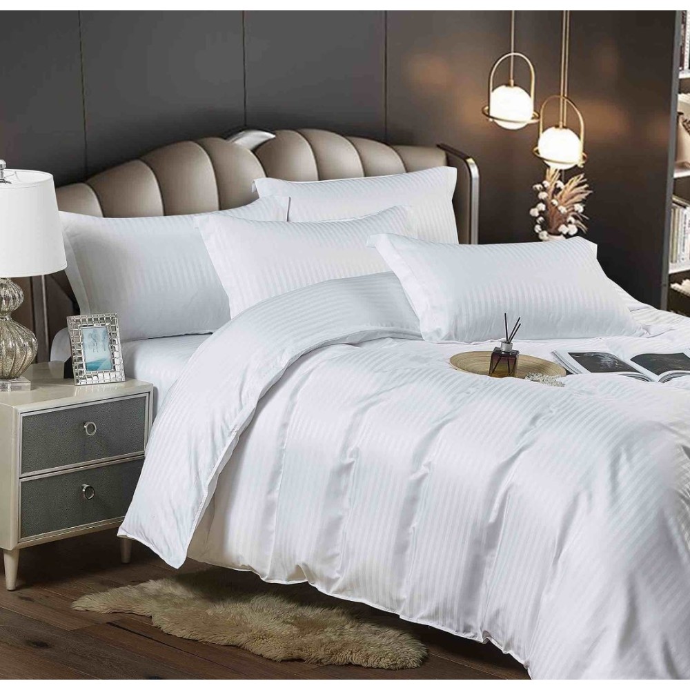 Lenjerie de pat dublu din damasc finetat, linear (tesatura din fabrica, ci nu imprimata, cu dunga de 1 cm grosime), confectionata din bumbac 70% + 30% poliester, cu 6 piese, folosita cel mai mult in regimul hotelier, datorita simplitatii si calitatii extraordinare. Materialul are un aspect usor lucios pentru o nota de eleganta si rafinament, datorita tesaturii speciale. Damascul este recunoscut pentru rezistenta sa in timp la nenumarate spalari, nemodificandu-si aspectul.
