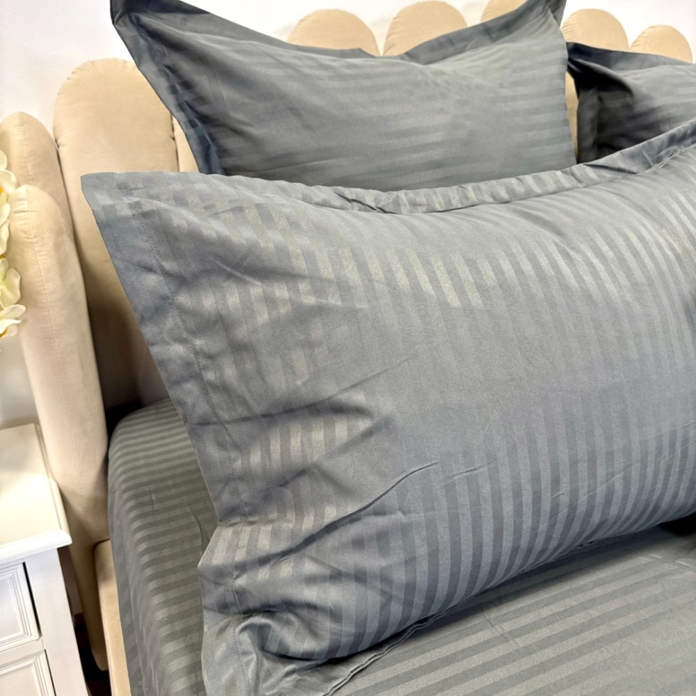 Lenjerie de pat dublu din damasc finetat, linear (tesatura din fabrica, ci nu imprimata, cu dunga de 1 cm grosime), confectionata din bumbac 70% + 30% poliester, cu 6 piese, folosita cel mai mult in regimul hotelier, datorita simplitatii si calitatii extraordinare. Materialul are un aspect usor lucios pentru o nota de eleganta si rafinament, datorita tesaturii speciale. Damascul este recunoscut pentru rezistenta sa in timp la nenumarate spalari, nemodificandu-si aspectul.