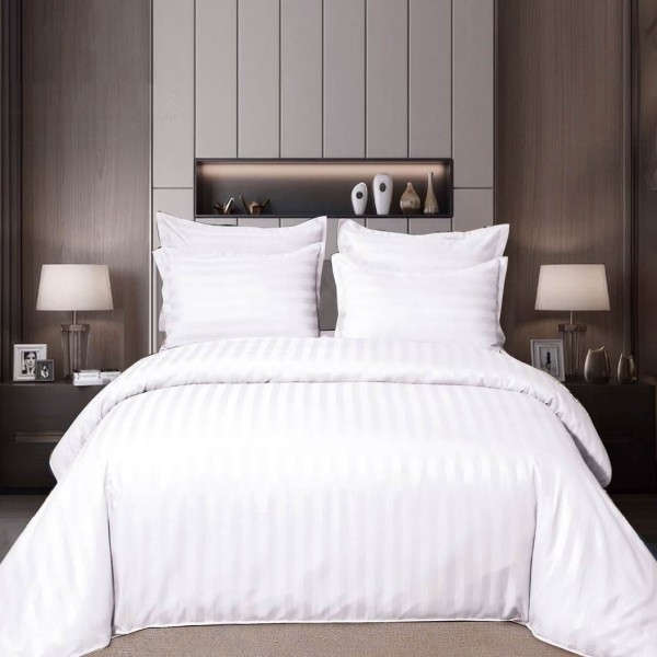 Lenjerie de pat dublu din damasc finetat, linear (tesatura din fabrica, ci nu imprimata, cu dunga de 1 cm grosime), confectionata din bumbac 70% + 30% poliester, cu 6 piese, folosita cel mai mult in regimul hotelier, datorita simplitatii si calitatii extraordinare. Materialul are un aspect usor lucios pentru o nota de eleganta si rafinament, datorita tesaturii speciale. Damascul este recunoscut pentru rezistenta sa in timp la nenumarate spalari, nemodificandu-si aspectul.