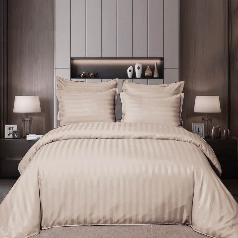 Lenjerie de pat dublu din damasc finetat, linear (tesatura din fabrica, ci nu imprimata, cu dunga de 1 cm grosime), confectionata din bumbac 70% + 30% poliester, cu 6 piese, folosita cel mai mult in regimul hotelier, datorita simplitatii si calitatii extraordinare. Materialul are un aspect usor lucios pentru o nota de eleganta si rafinament, datorita tesaturii speciale. Damascul este recunoscut pentru rezistenta sa in timp la nenumarate spalari, nemodificandu-si aspectul.