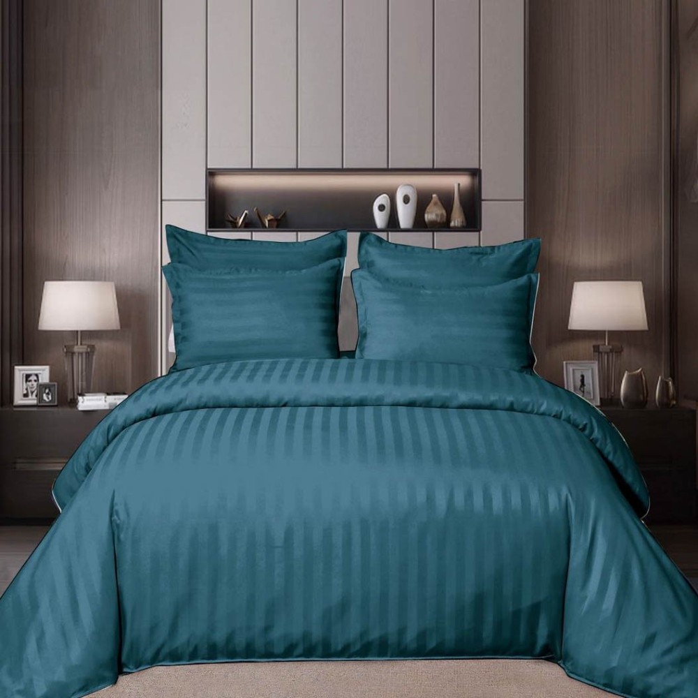 Lenjerie de pat dublu din damasc finetat, linear (tesatura din fabrica, ci nu imprimata, cu dunga de 1 cm grosime), confectionata din bumbac 70% + 30% poliester, cu 6 piese, folosita cel mai mult in regimul hotelier, datorita simplitatii si calitatii extraordinare. Materialul are un aspect usor lucios pentru o nota de eleganta si rafinament, datorita tesaturii speciale. Damascul este recunoscut pentru rezistenta sa in timp la nenumarate spalari, nemodificandu-si aspectul.