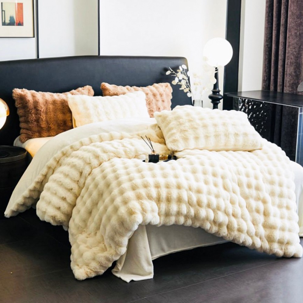 Lenjerie Luxury Pat Dublu, ExtraPufoasa, din Blanita Artificiala tip Iepure, 4 piese, Crem, cod produs: EST-RB-06