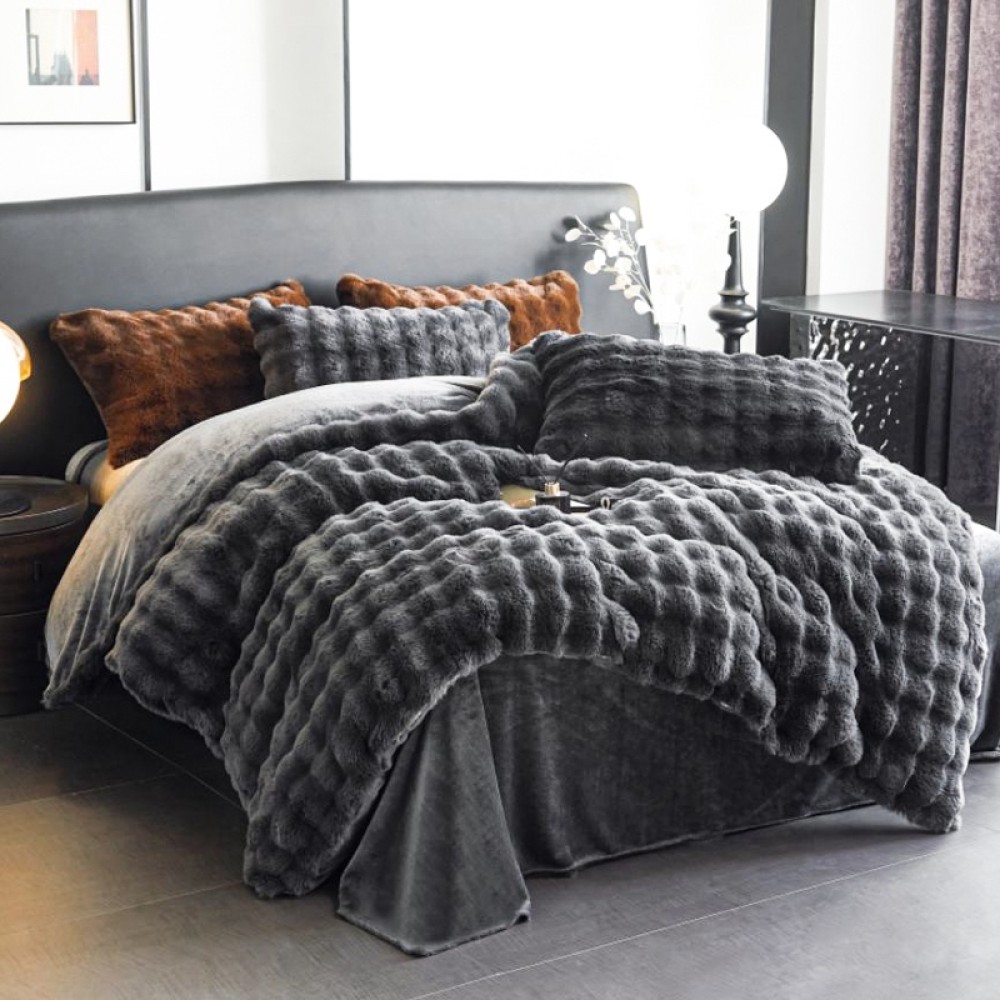 Lenjerie de Pat Dublu cu Blăniță Artificială de Iepure – 4 Piese, Ultra-Pufoasă și Călduroasă