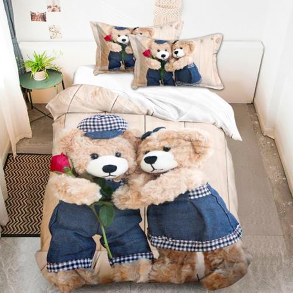 Lenjerie pat 1 PERSOANA (90x200cm, 100x200cm, 120x200cm), BUMBAC FINET, 4 piese, Identică cu Poza, Imprimeu Digital, Crem, Albastru, Ursulet, Casa Minunata, cod produs: YN-SNG-05