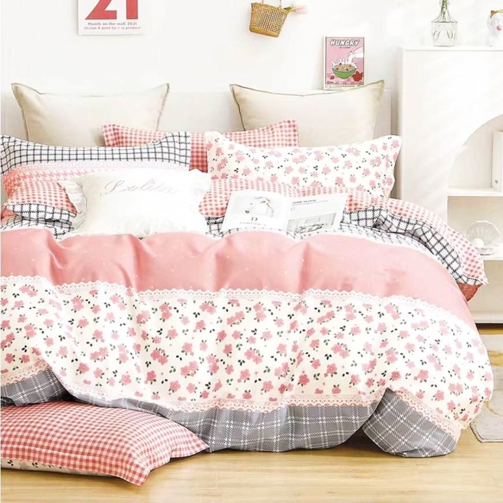 Lenjerie pat dublu (140x200cm, 160x200cm, 180x200cm), FINET Satinat, 6 piese, Alb, Roz, Flori, Casa Minunata, cod produs: YN-FN-08