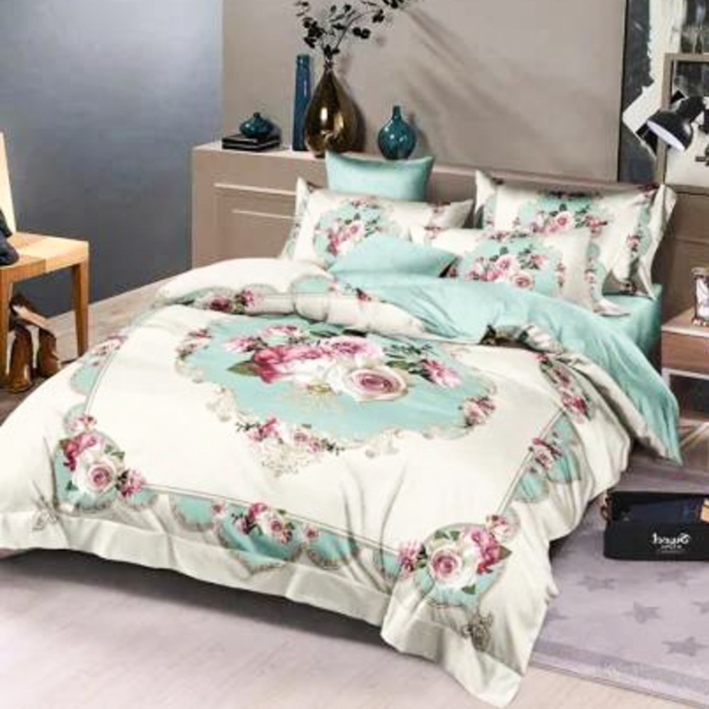Lenjerie pat dublu (140x200cm, 160x200cm, 180x200cm), FINET Satinat, 6 piese, Crem, Bleu, Flori, Casa Minunata, cod produs: YN-FN-11