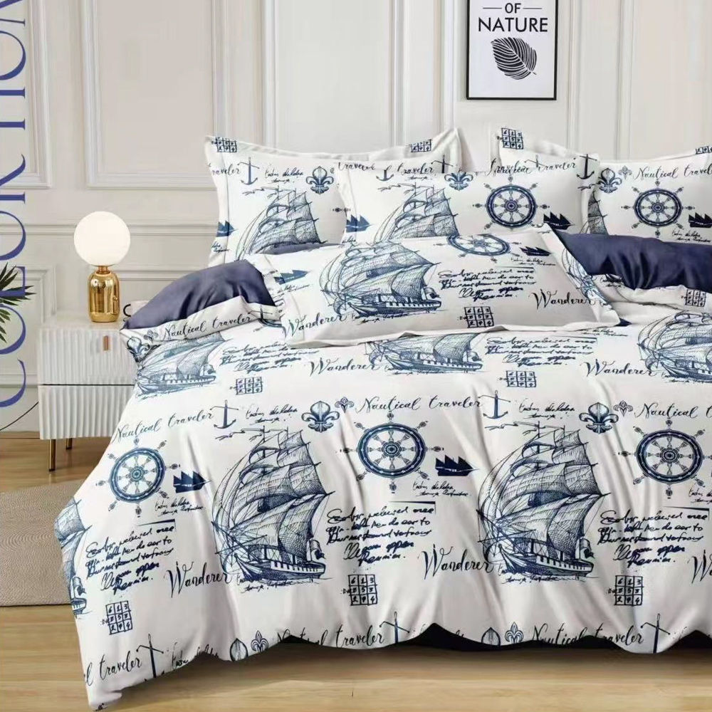 Lenjerie pat dublu (140x200cm, 160x200cm, 180x200cm), FINET, 6 piese, Alb, Albastru, vapoare, East Romania, cod produs: EST-FN-369