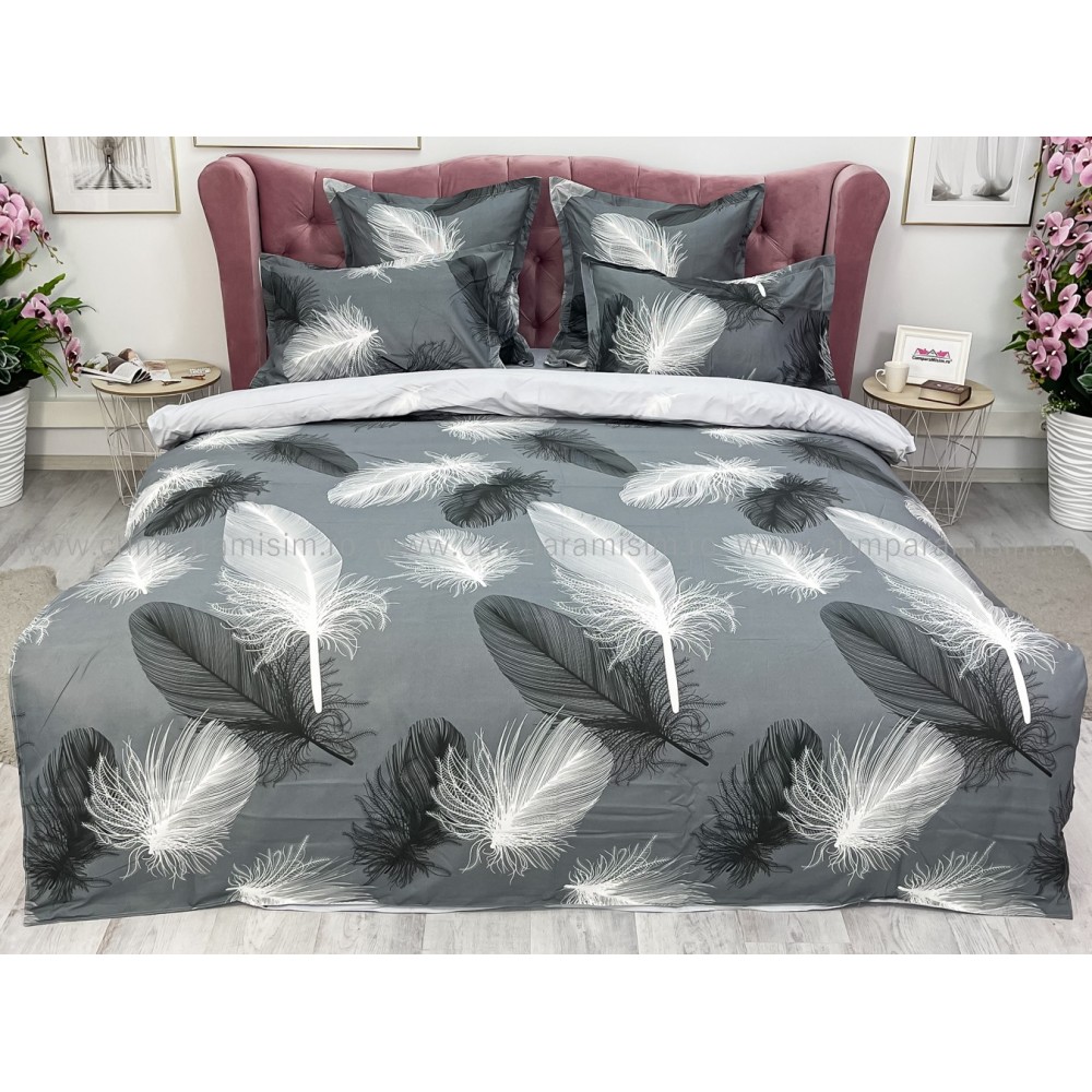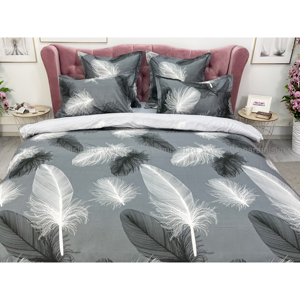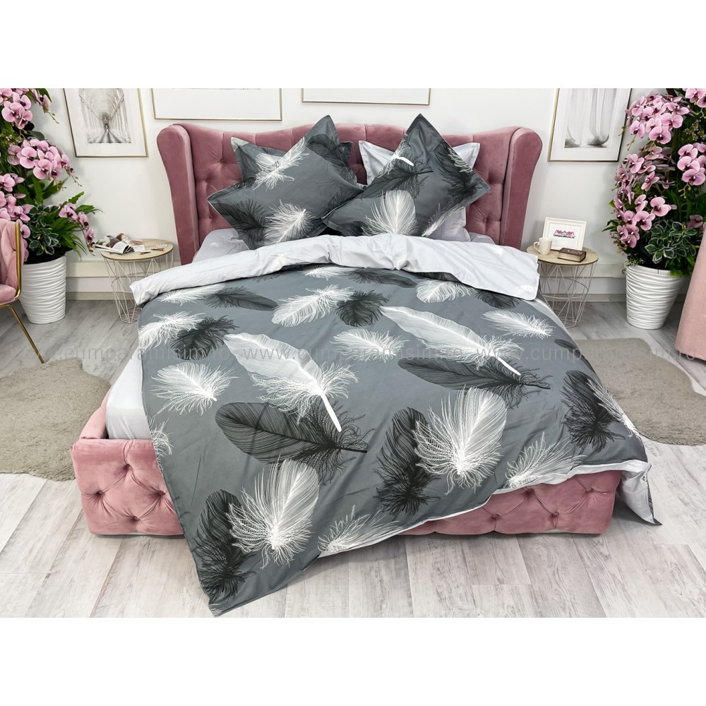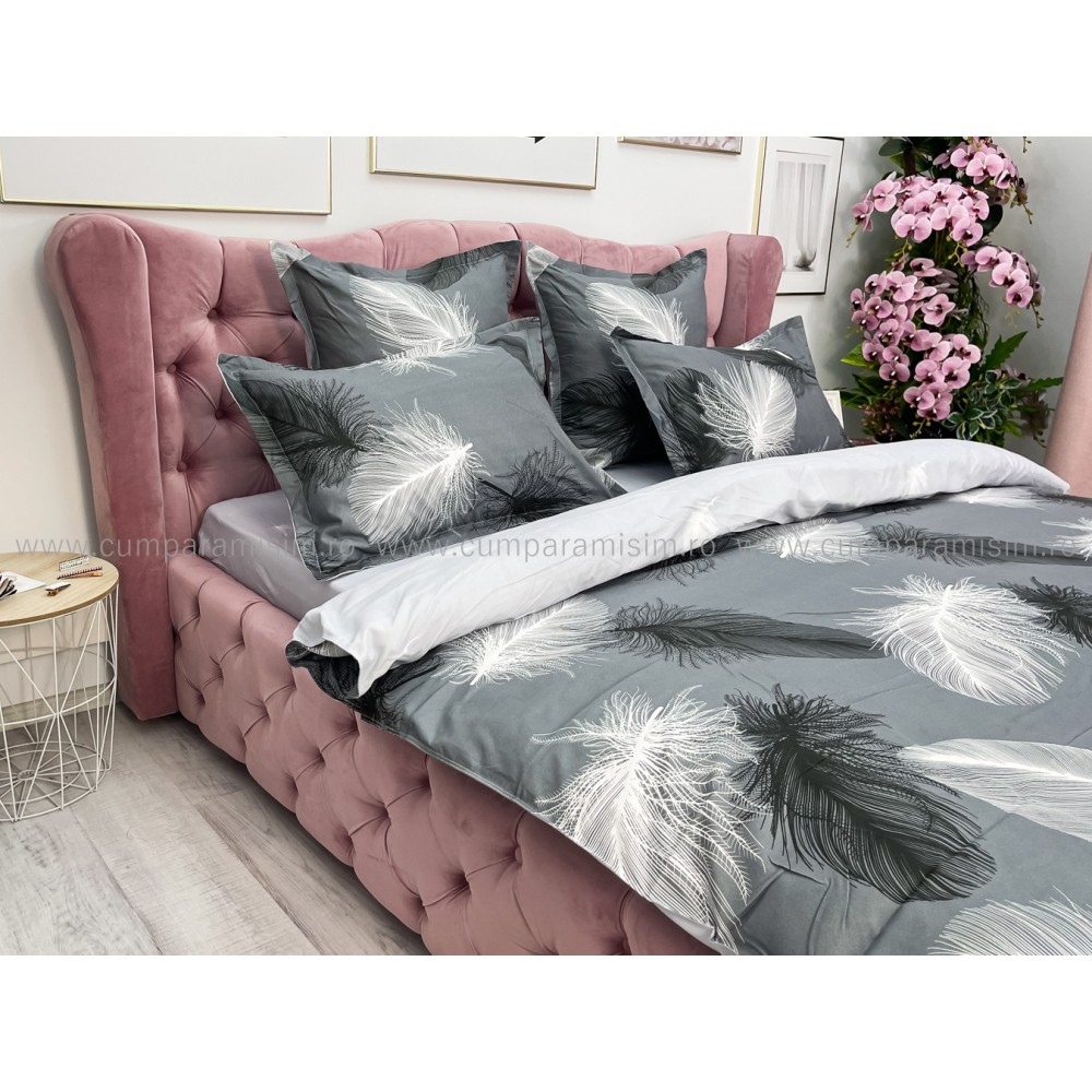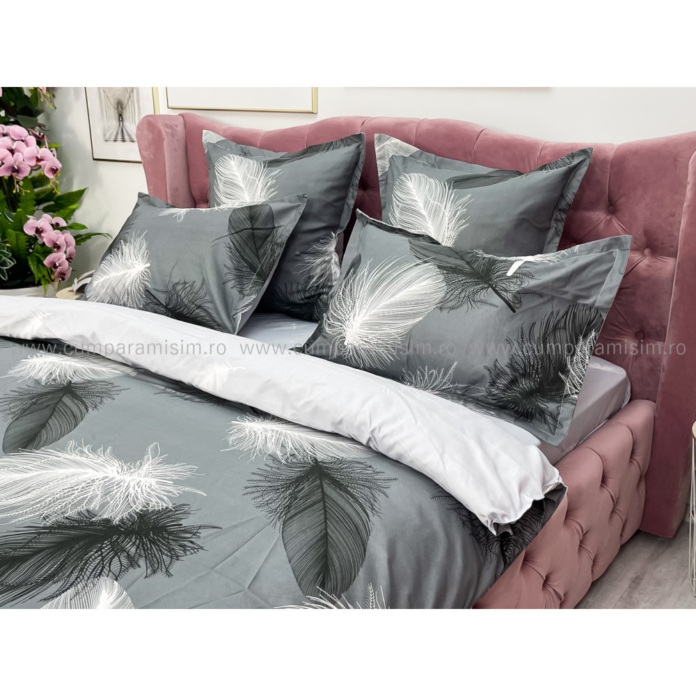 Lenjerie pat dublu, FINET, 6 piese, cu ELASTIC, Jojo Home, Gri-Alb, pene, cod produs: JOJ-FE-04