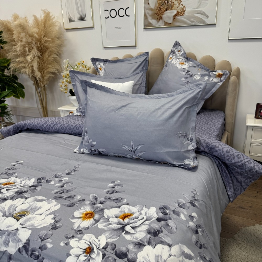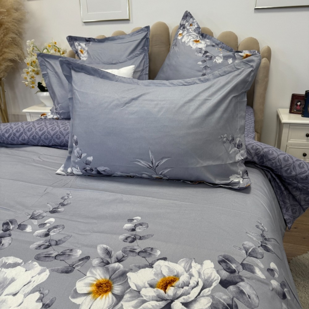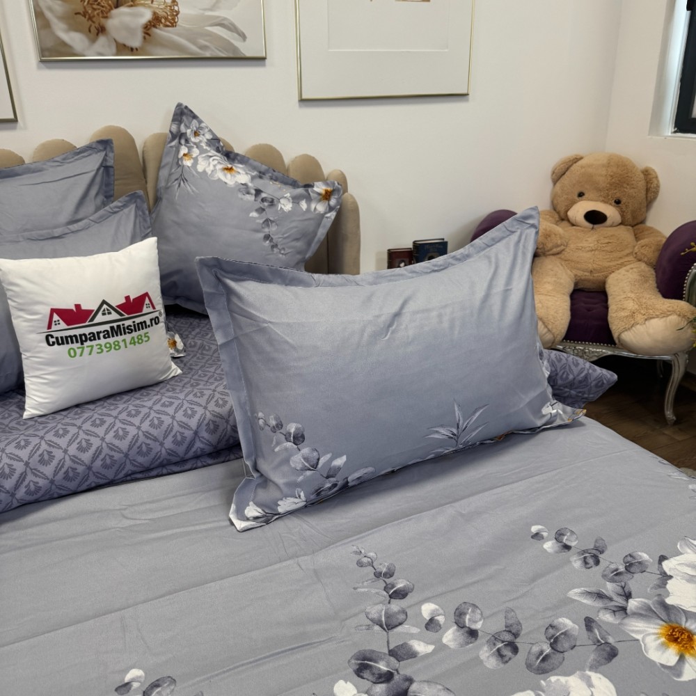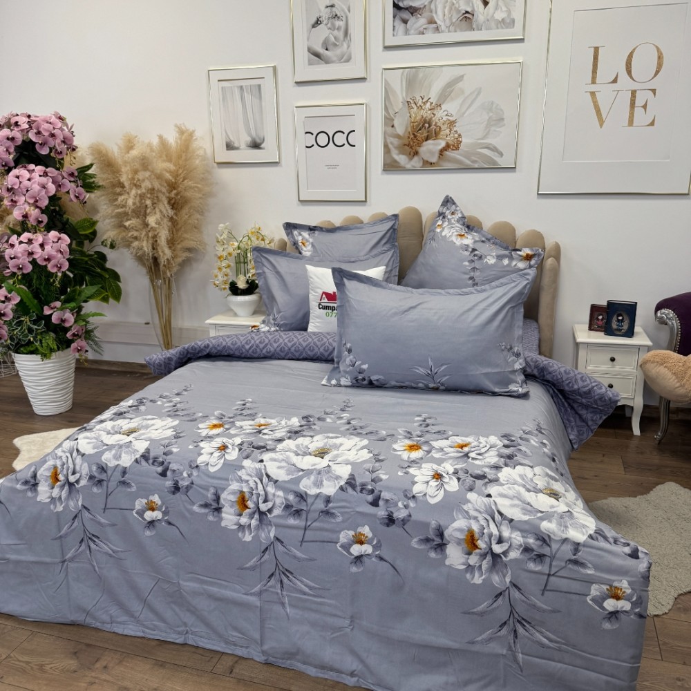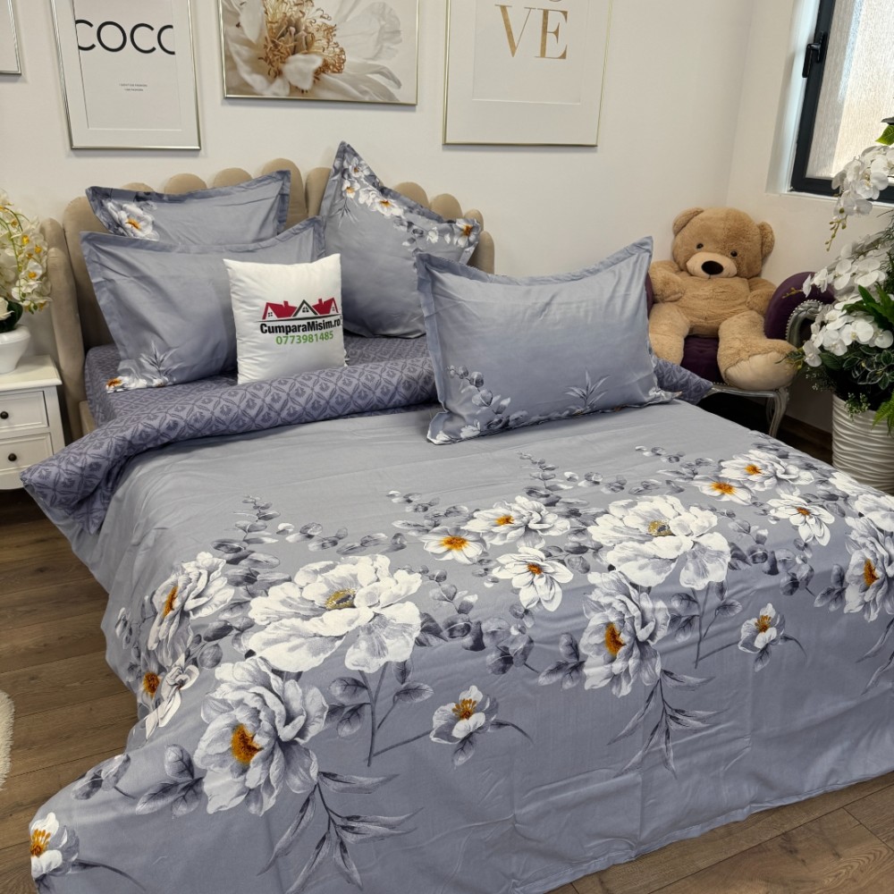 Lenjerie pat dublu, FINET, 6 piese, cu ELASTIC, Jojo Home, Gri-Movuriu, flori, cod produs: JOJ-FE-03