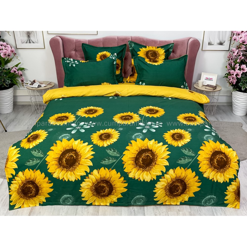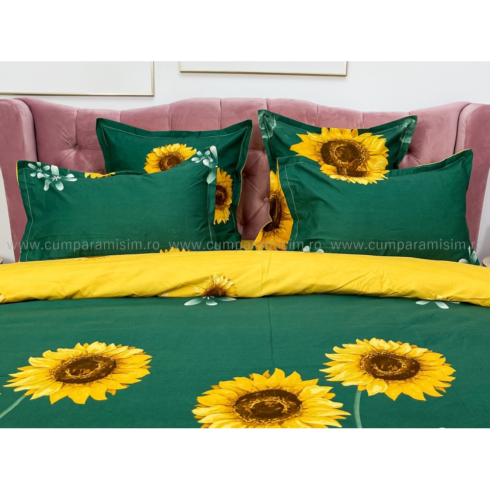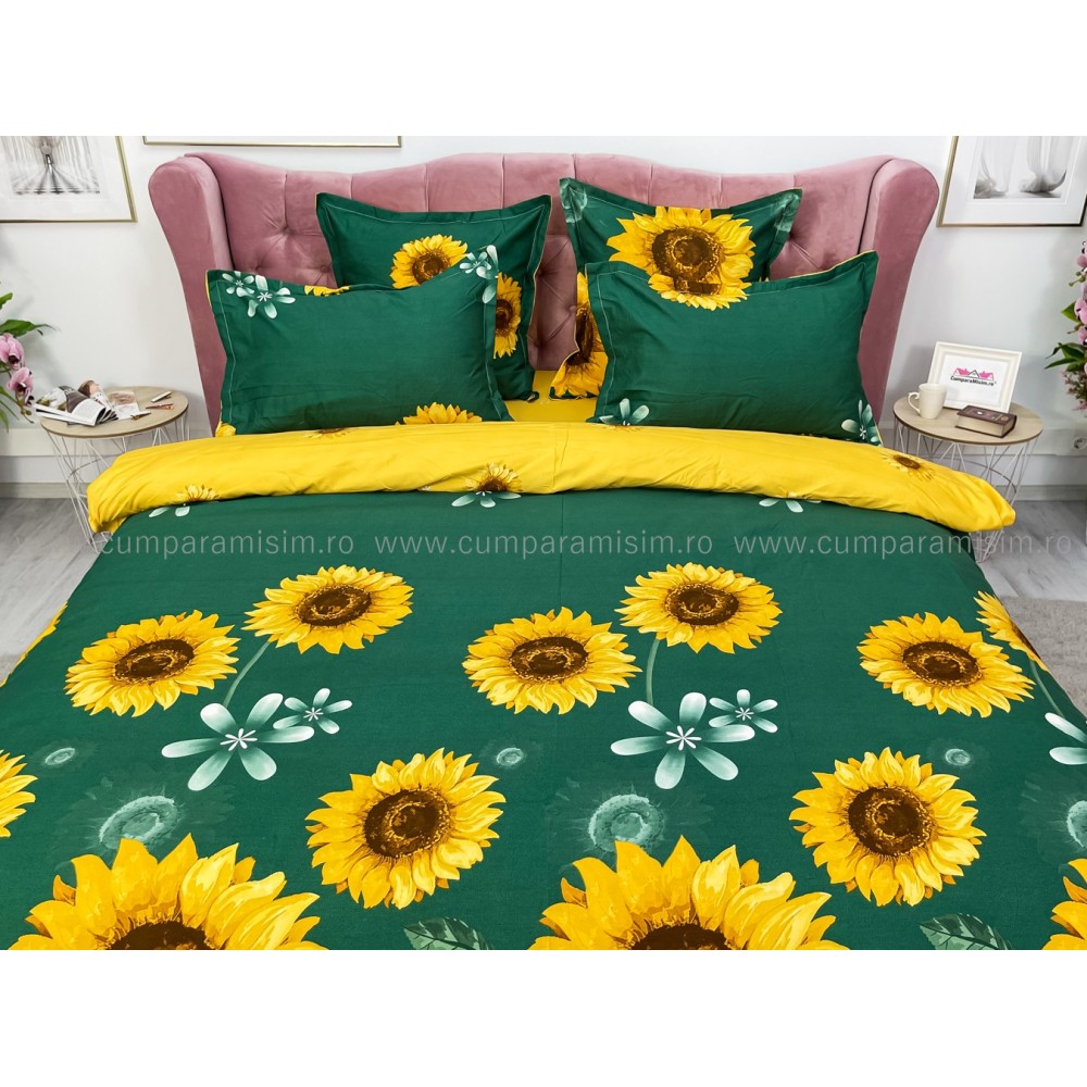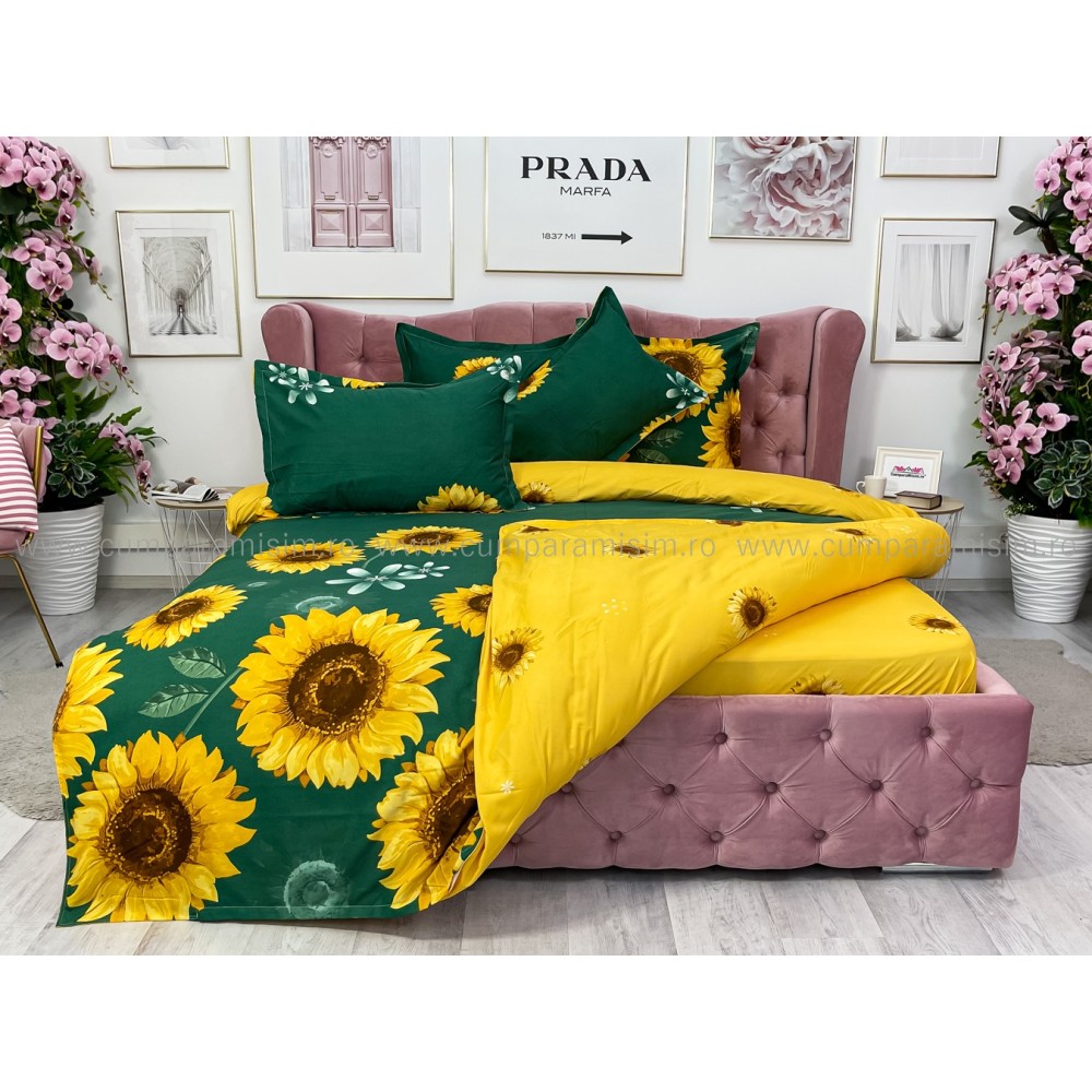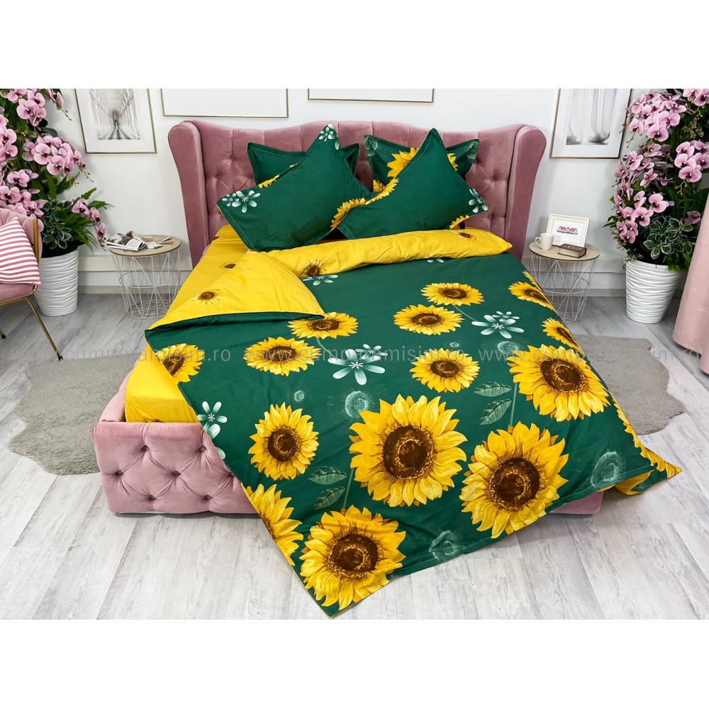 Lenjerie pat dublu, FINET, 6 piese, cu ELASTIC, Jojo Home, Verde-Galben, floarea soarelui, cod produs: JOJ-FE-09