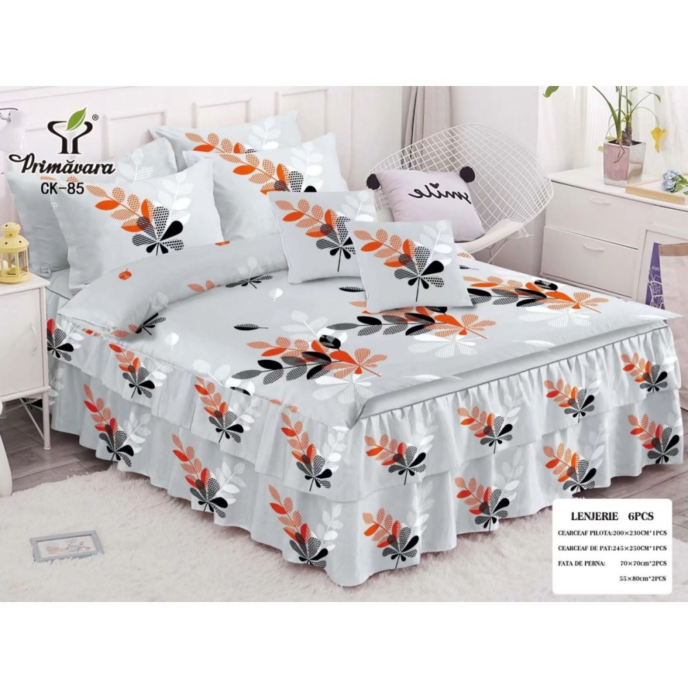 Lenjerie de pat dublu din Bumbac, tesatura Finet, cu volanase, identica cu poza. Pe partea de jos a cearsafului de pat, aveti asezate superbele volanase, care oferta acestor modele eleganta si rafinament. Fetele de perna se inchid cu flep (petrecute). Cearsaful de pat are prins pe fiecare colt cate un elastic care vine prins sub saltea, pentru a nu permite alunecarea cearsafului de pe pat.