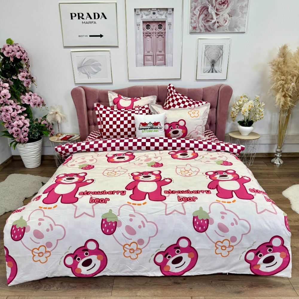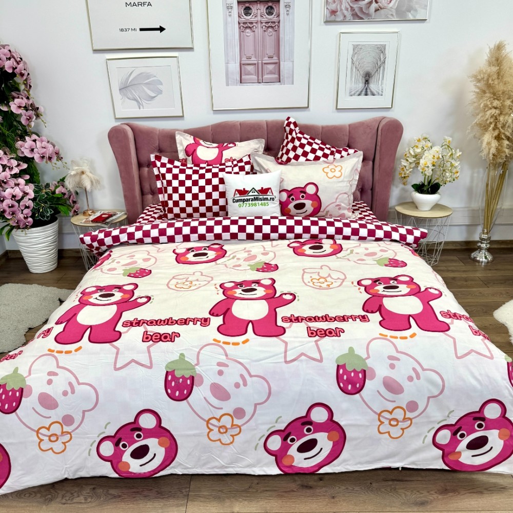 Lenjerie pat dublu, FINET, 6 piese, Jojo Home, Roz, ursuleti, capsune, cod produs: JOJ-FN-57