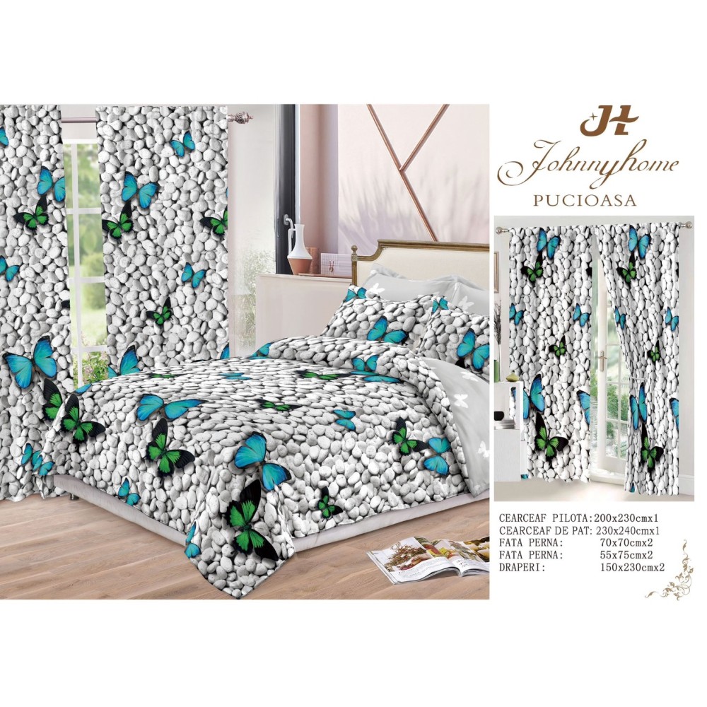 Set lenjerie de pat din bumbac finet, 8 piese, cu draperii incluse – Model fluturi